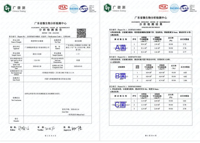 UV除菌バックに内蔵される高性能UV除菌ライトは、専門の検査機関「産業微生物学広州試験センター(Guangzhou Testing Center of Industrial Microbiology)」による検査・性能テストをしております。