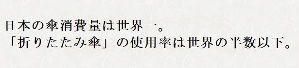 日本はどこでも傘が購入できる一方で、傘を大切にする意識が低い国です。その要因として挙げられるのが「傘といえば(短期利用の)ビニール傘」という意識。実際に使用する傘の内訳として「折りたたみ傘」は世界平均で55%にも関わらず、日本では21%と半数以下の数値となっています。