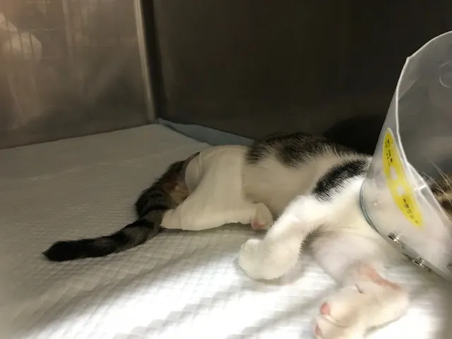 紹介して頂いた病院に連れて行ったところ、こんなに酷い状態だとは電話では伝わっていなかったらしく、子猫ということもあり、一番に命を優先し、体力的に無理のない手術を先生たちが選択。早急に先生たちで入念なミーティングをして頂き、その日の18時から手術開始。およそ三時間にわたる大手術でした。次の日、面会に家族で向かったところ、体調は良く、肺にも穴が開いていたけれど自分で自然治癒しようとしているので、無理に人の手を加えて体力的にも負担をかけるのはよくないみたいでした。右前足は唯一骨に異常はなかったのですが、神経が損傷しているらしくもう動かすことができないようです。今後その前足を本人が移動する際、邪魔になりストレスを感じるようになれば切断しなければならないようです。