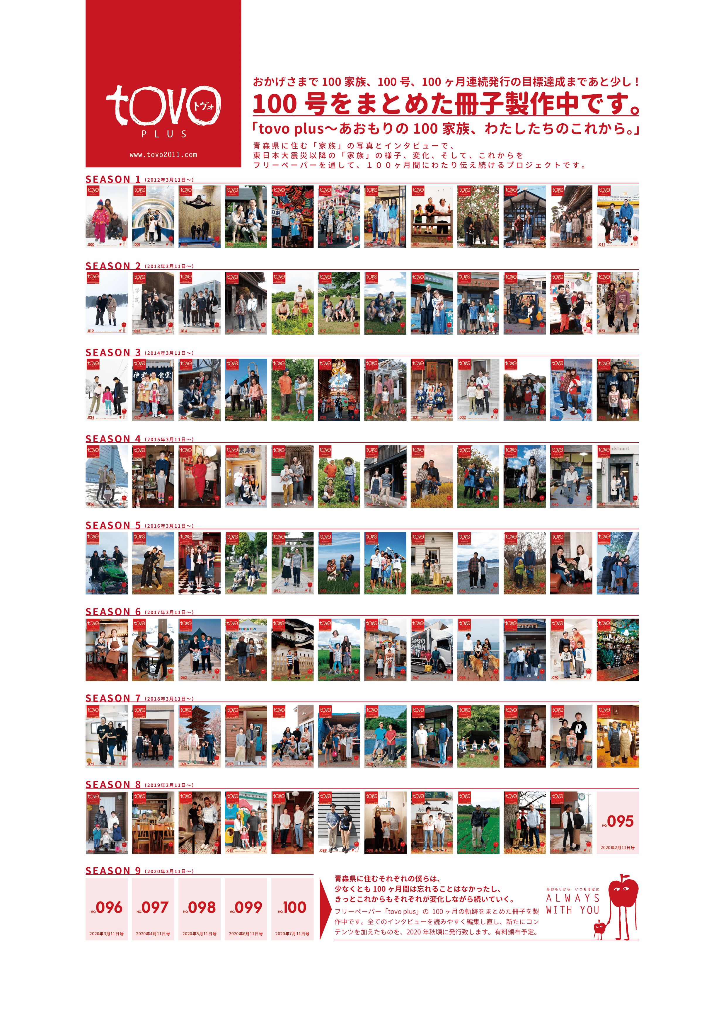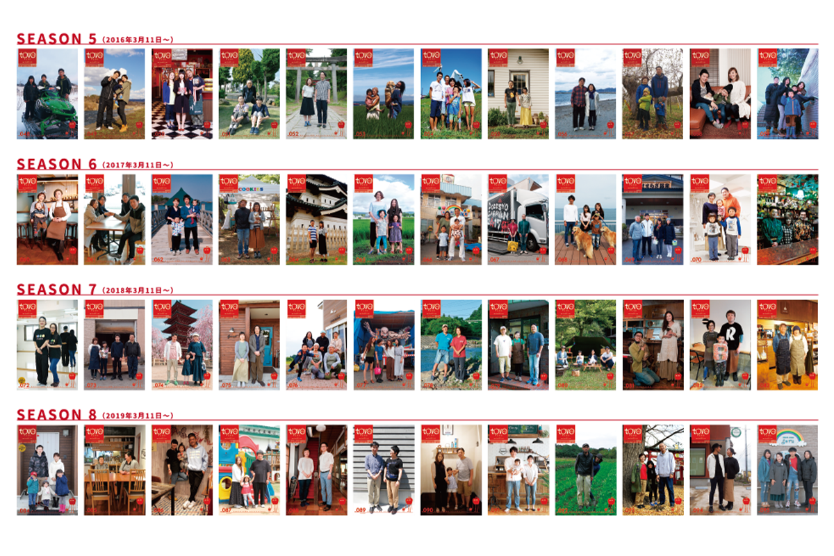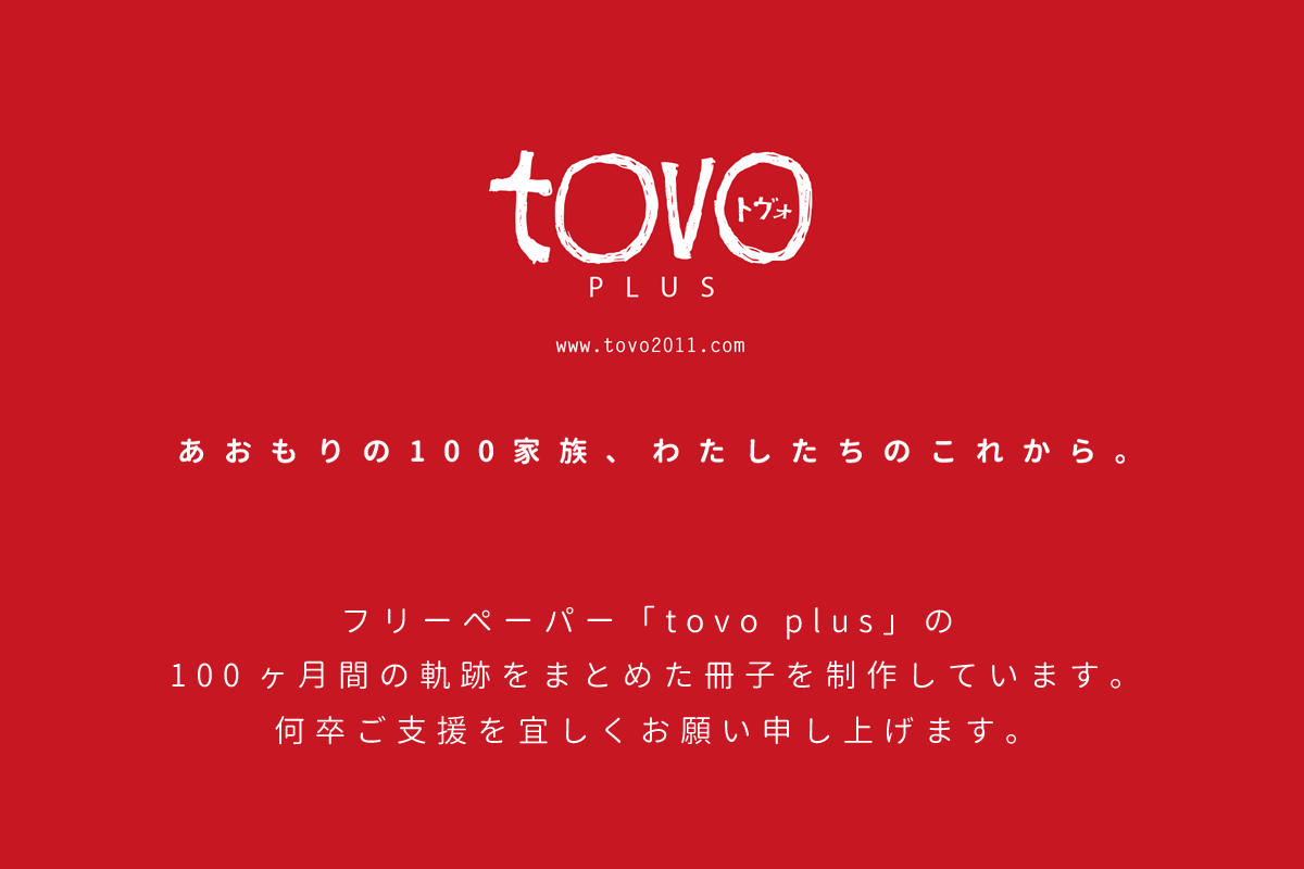 「tovo plus」は、2011年3月11日のことを、大きなメディアが取り上げることのない青森県内に住むごく普通のご家族に、同じ質問を100ヶ月にわたり聞き続けたフリーペーパーです。震災直後に伺った話だけではなく、発行ごとに1ヶ月の時間が経過していきます。つまり、インタビューされた日から311を振り返って、今、それぞれのご家族が何を考え、震災をどうとらえ、また、それをどのように生かしていこうと思うのかを記録するなかなか知ることのできない証言です。これをまとめて1冊にして残すことは、後世の貴重な記録になることと考えています。