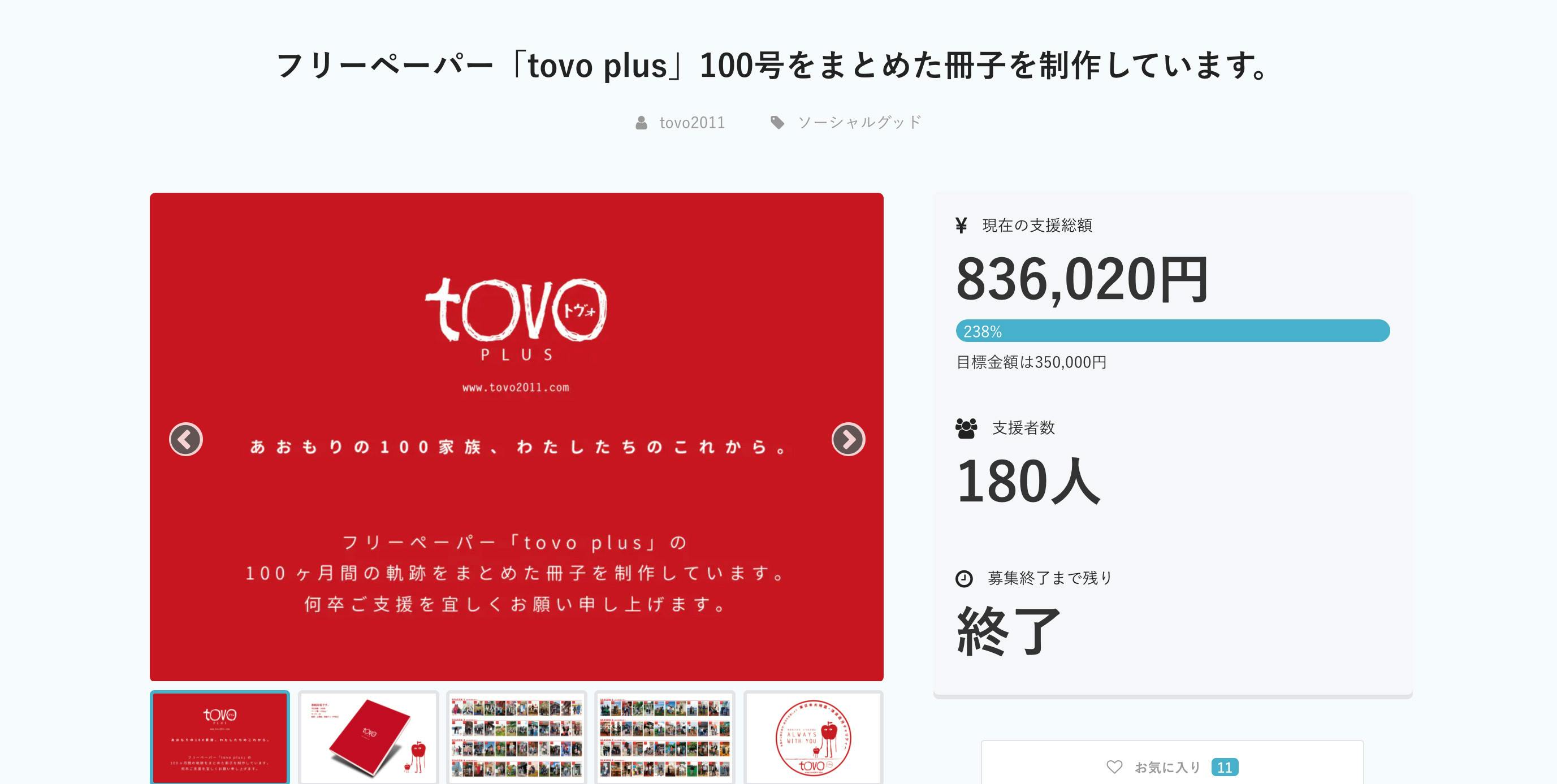 2020/08/24 06:47支援者の皆さま、おかげさまで、昨晩、2020年8月23日、クラウドファンディングの期間が終了し、最終的に180名の方より「836,020円」のご支援をいただき、目標額を大きく超え、達成率238%となりました。ご支援頂いた皆さま、このプロジェクトを紹介、シェア頂いた皆さま、そして、温かいコメントをくださった皆さま、すべての皆さまに深くお礼申し上げます。ありがとうございました。フリーペーパーtovo plusは、2012年3月より100号を目指して発行をはじめました。しっかりしたコンセプトをたて自信に満ちたスタートでしたが、とてもとても長い間、評価を感じられず寂しい思いを続けながらの発行だったように思います。今回、200%を超えるご支援をいただきましたこと、今までの長い道のりの様々な経験や思いが、全て報われたように感じています。本当にありがとうございました。冊子の方の編集作業は順調に進んでおります。これよりご支援を頂戴した皆さまのご芳名(希望された方)を記載させていただく作業を経て、予定通り、2020年8月末〜 印刷開始(1ヶ月)2020年9月末〜 発送開始という流れで進めさせていただきます。冊子の到着までしばらくお待ちいただくこととなりますが、何卒ご了承頂きますようお願い申し上げます。フリーペーパー「tovo plus」のプロジェクトは今回の冊子をもって終了となりますが、東日本大震災津波遺児チャリティ「tovo」の活動は、目標の活動期間10年まで残り1年ございます。先般、フリーペーパー「tovo plus」の代わりとなるYouTube配信番組「ちんとぼ」もスタートしております。残り1年、なんとか継続できるよう工夫と努力を重ねてまいりますので、今後とも何卒ご支援のほど、宜しくお願い申し上げます。それでは、今回はありがとうございました!! もっと見る