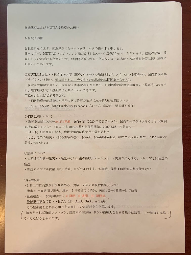 月の飼い主として、個人的な自己責任と判断のうえで月にとって投与が必要と考えていますが、全てのFIPの猫に有効であるという趣旨ではありません。