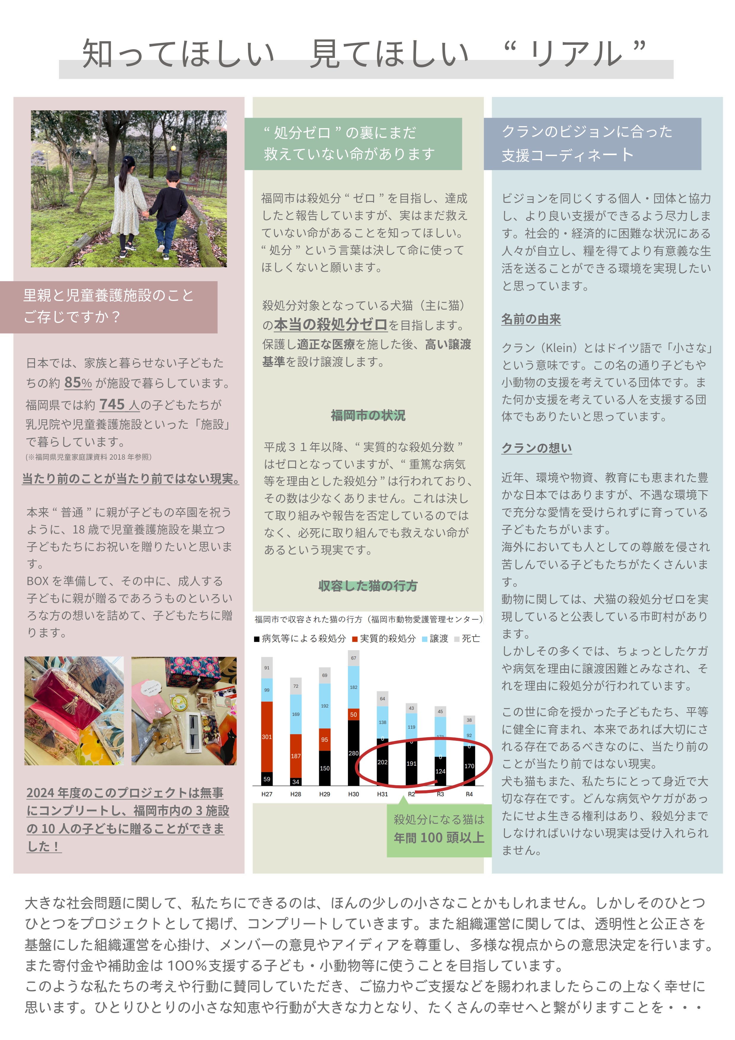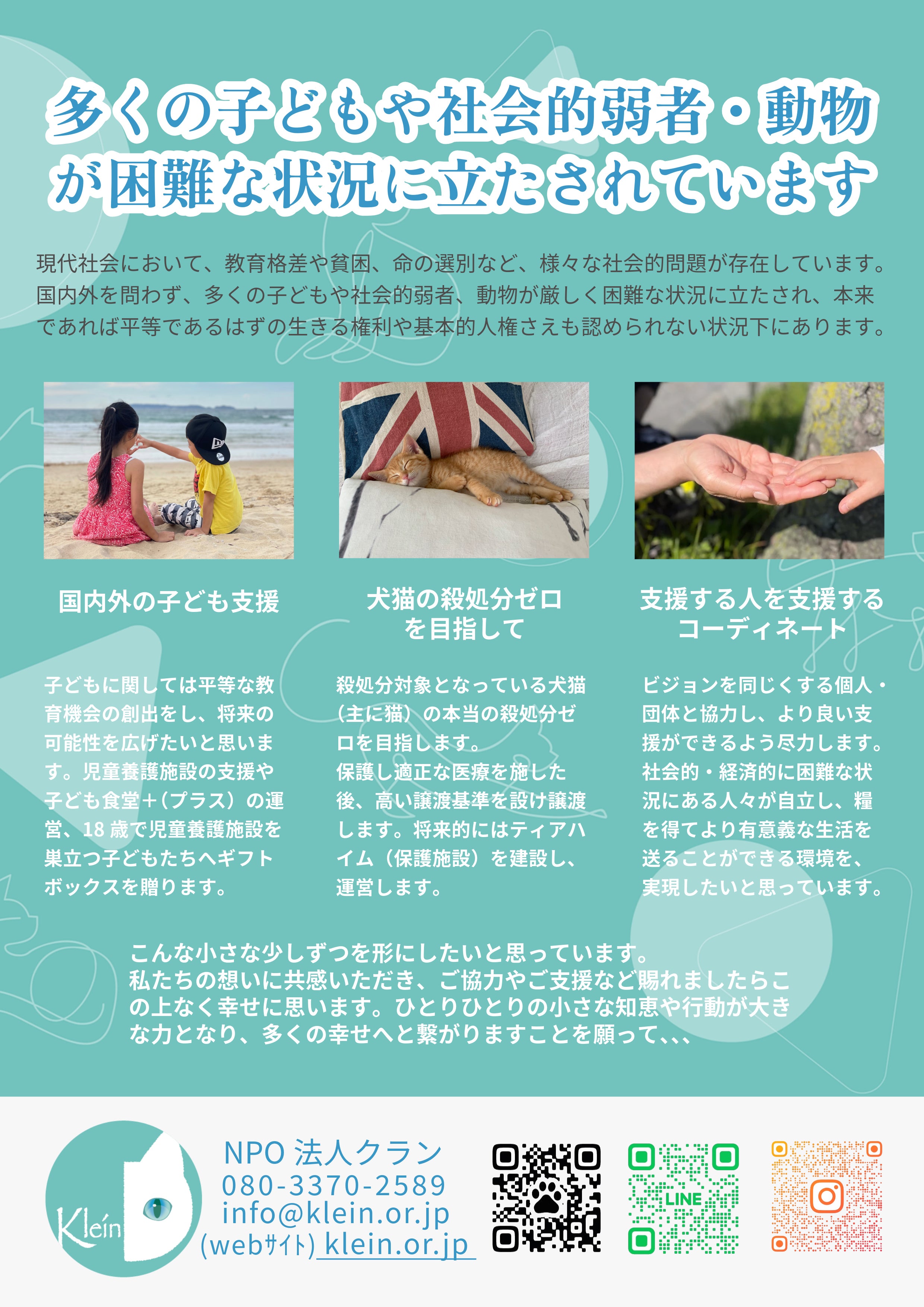 この名の通り、子どもや小動物の支援を考えている団体です。また、何か支援を考えている人を支援する団体でもありたいと思っています。