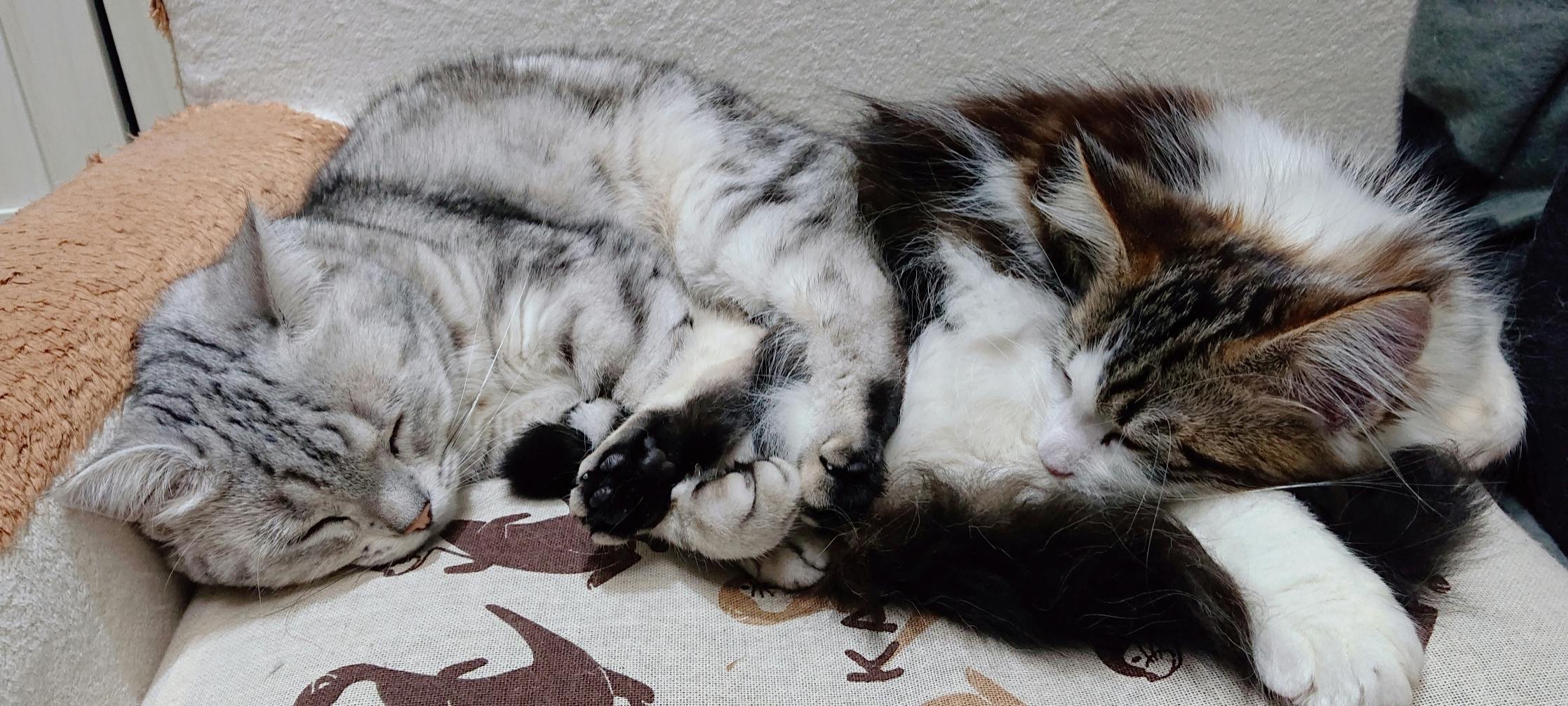 アメショの男の子は新しく来た弟分を心底可愛がり、女王様気質であまり他の猫と馴れ合わない女の子も一緒に寝ることを許すくらいの強者です。