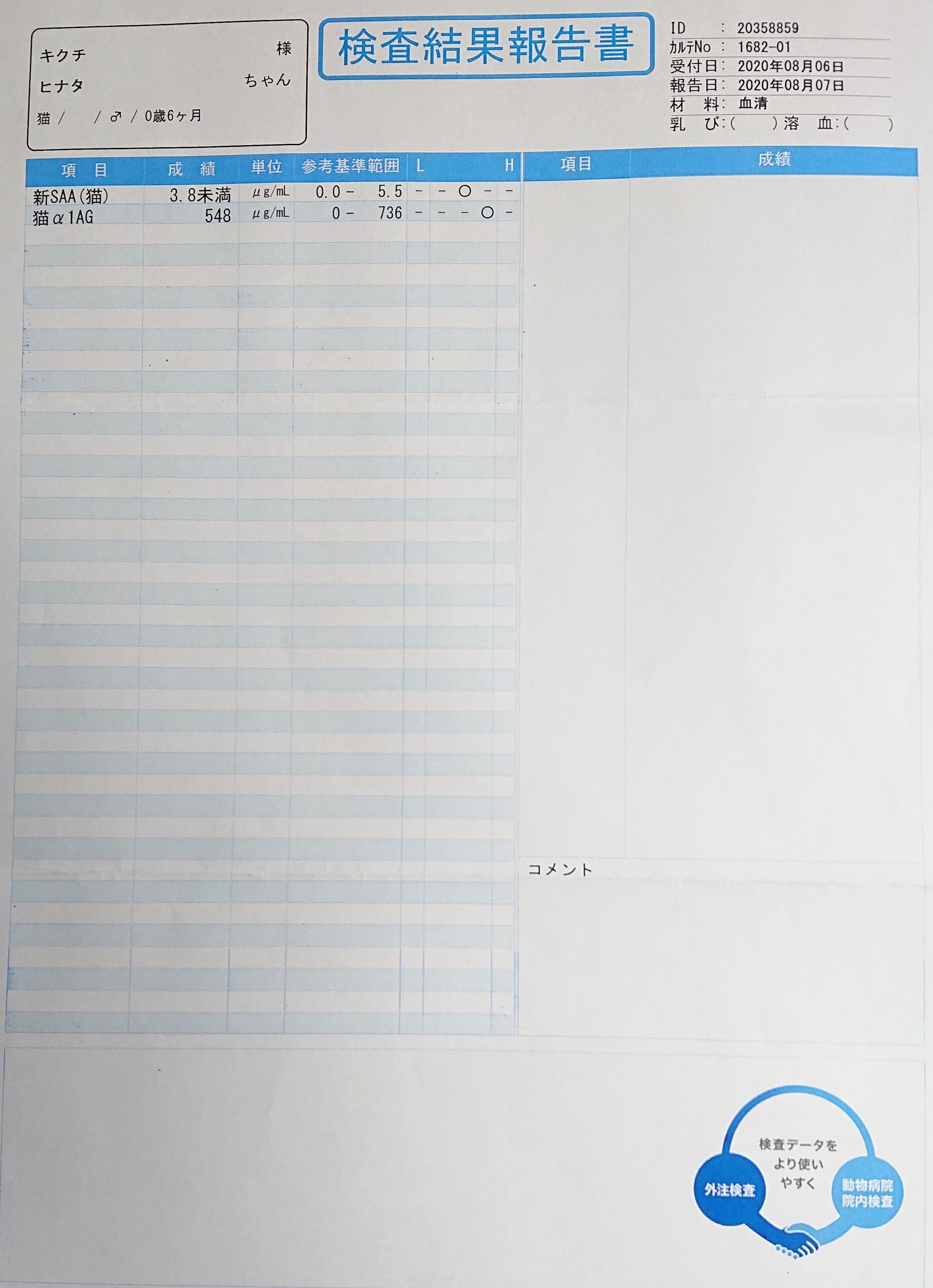 本日病院から前回の外注検査の結果が届きました。