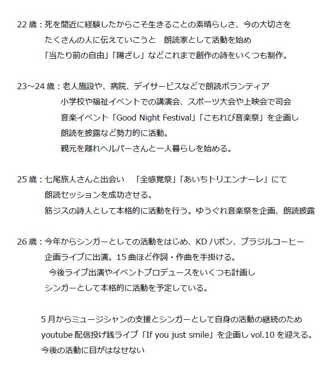 20歳の時、浅い呼吸で心臓に負荷をかけていたことが原因で心不全と診断され余命1か月と宣告される(北海道の筋ジスの専門の八雲病院にて最後の望みをかけ呼吸器の装着と薬用治療を行い奇跡的に回復)