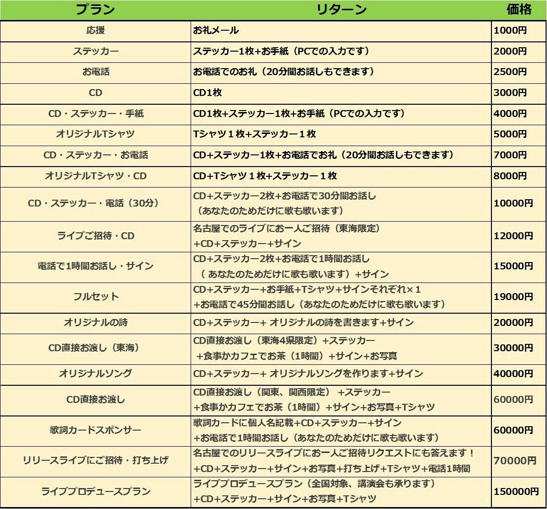 リターンとして、CD以外にもステッカーやお電話でのお礼プラン直接手渡しをするプラン