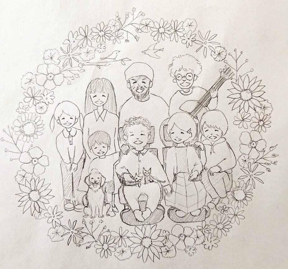 上記のイラストは花笑みというタイトルの通り、人と動物、年齢、障がい、性別が様々な者たちが、花のような笑顔で一緒に笑っているイメージのイラストです。