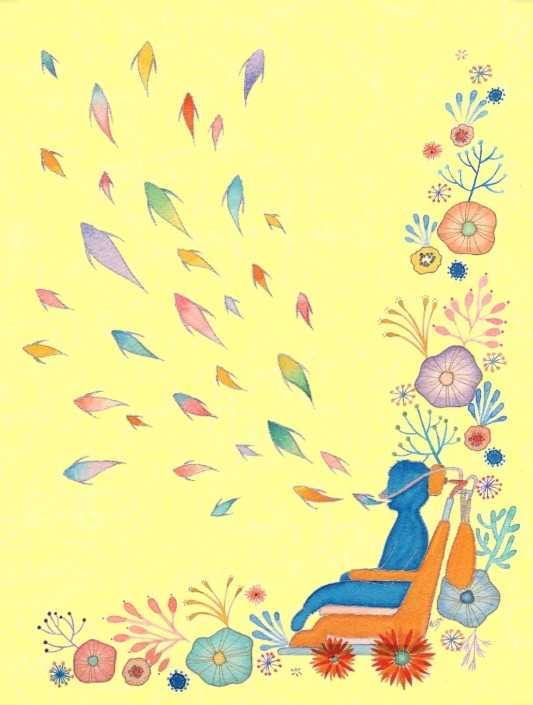 歌声が魚になって勢いよく泳ぎだしていて、命の力強さと生き生きとした表情を描いて頂きました。
