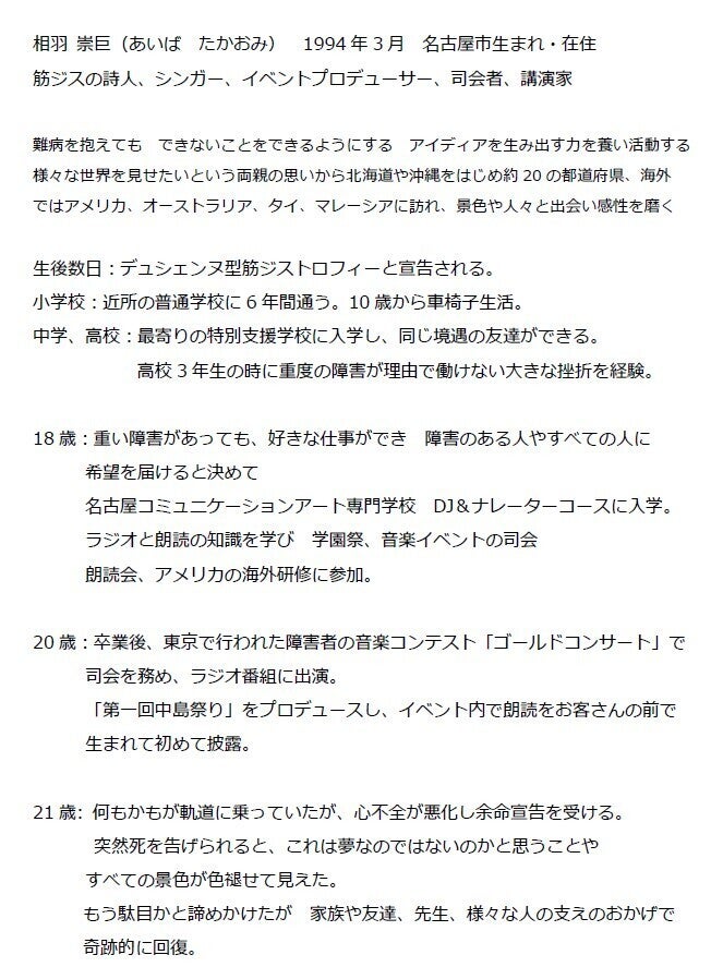 皆さま、はじめまして! 筋ジスの詩人・呼吸器シンガーの相羽崇巨(あいば たかおみ)と申します。