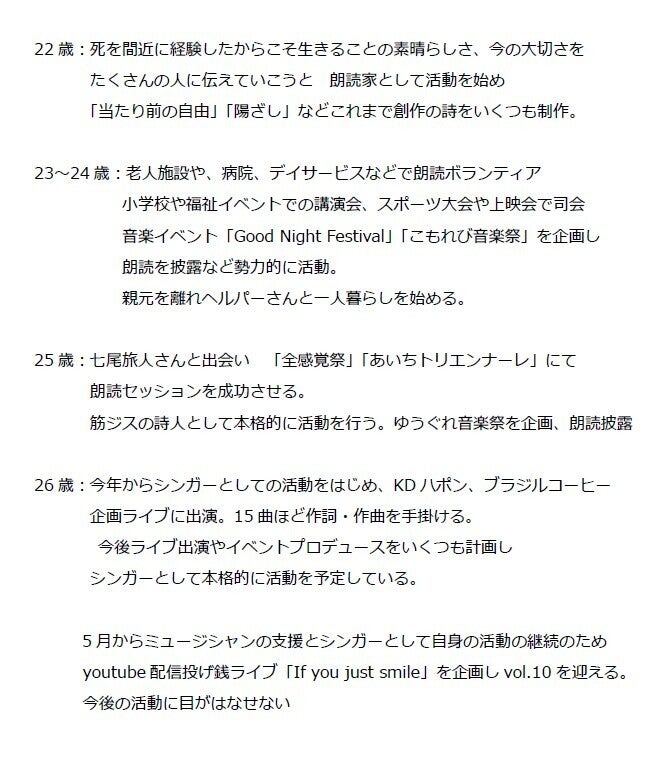 20歳の時、浅い呼吸で心臓に負荷をかけていたことが原因で心不全と診断され余命1か月と宣告される(北海道の筋ジスの専門の八雲病院にて最後の望みをかけ呼吸器の装着と薬用治療を行い奇跡的に回復)