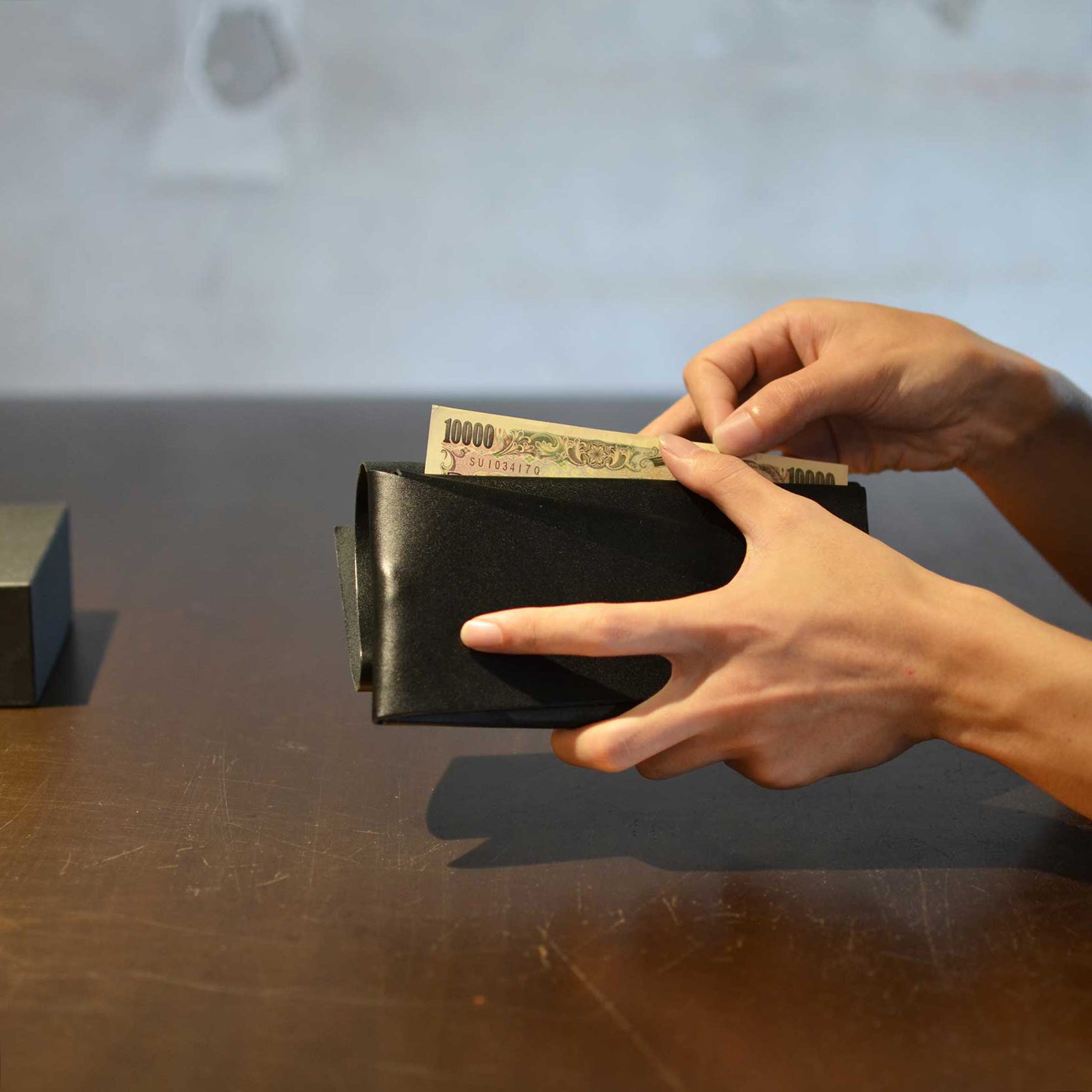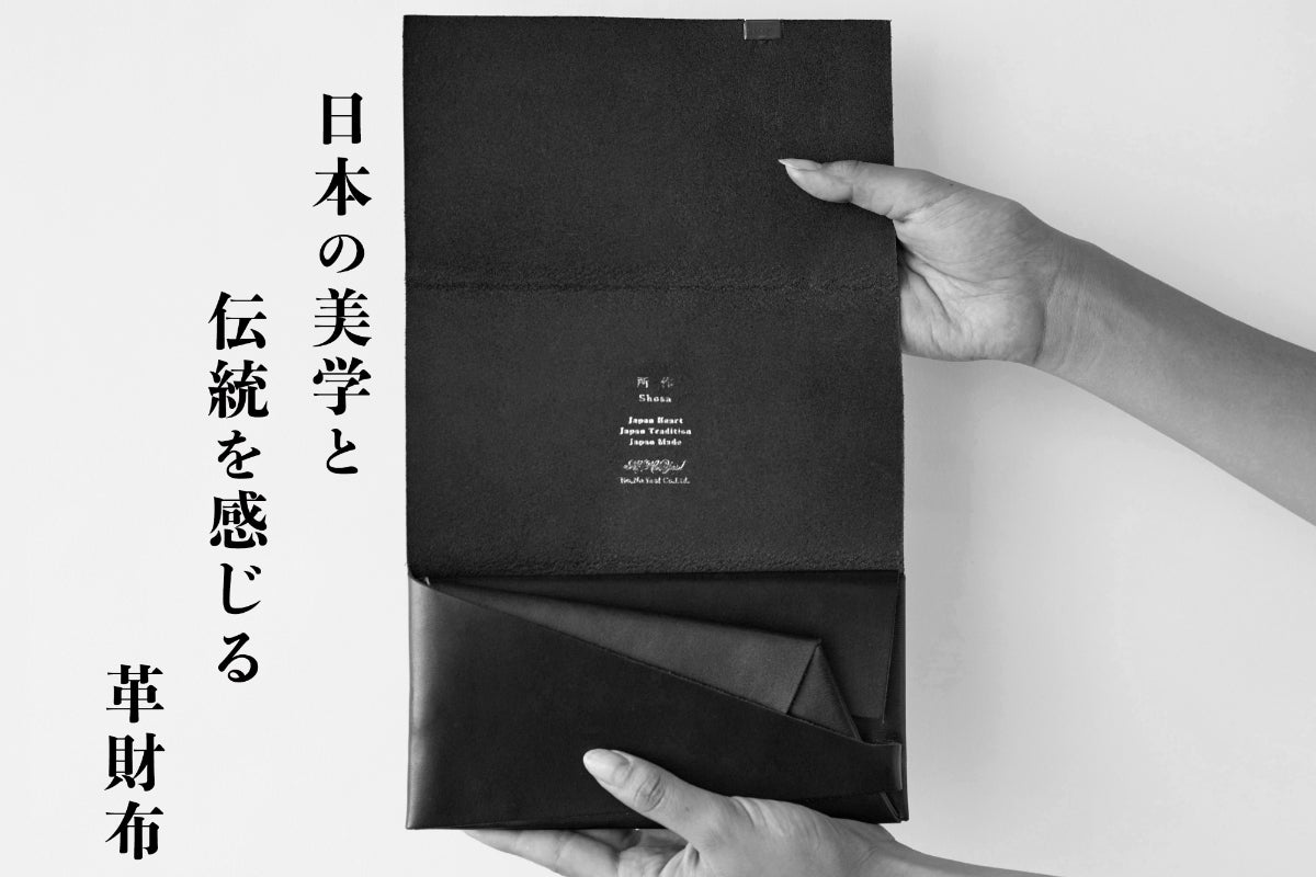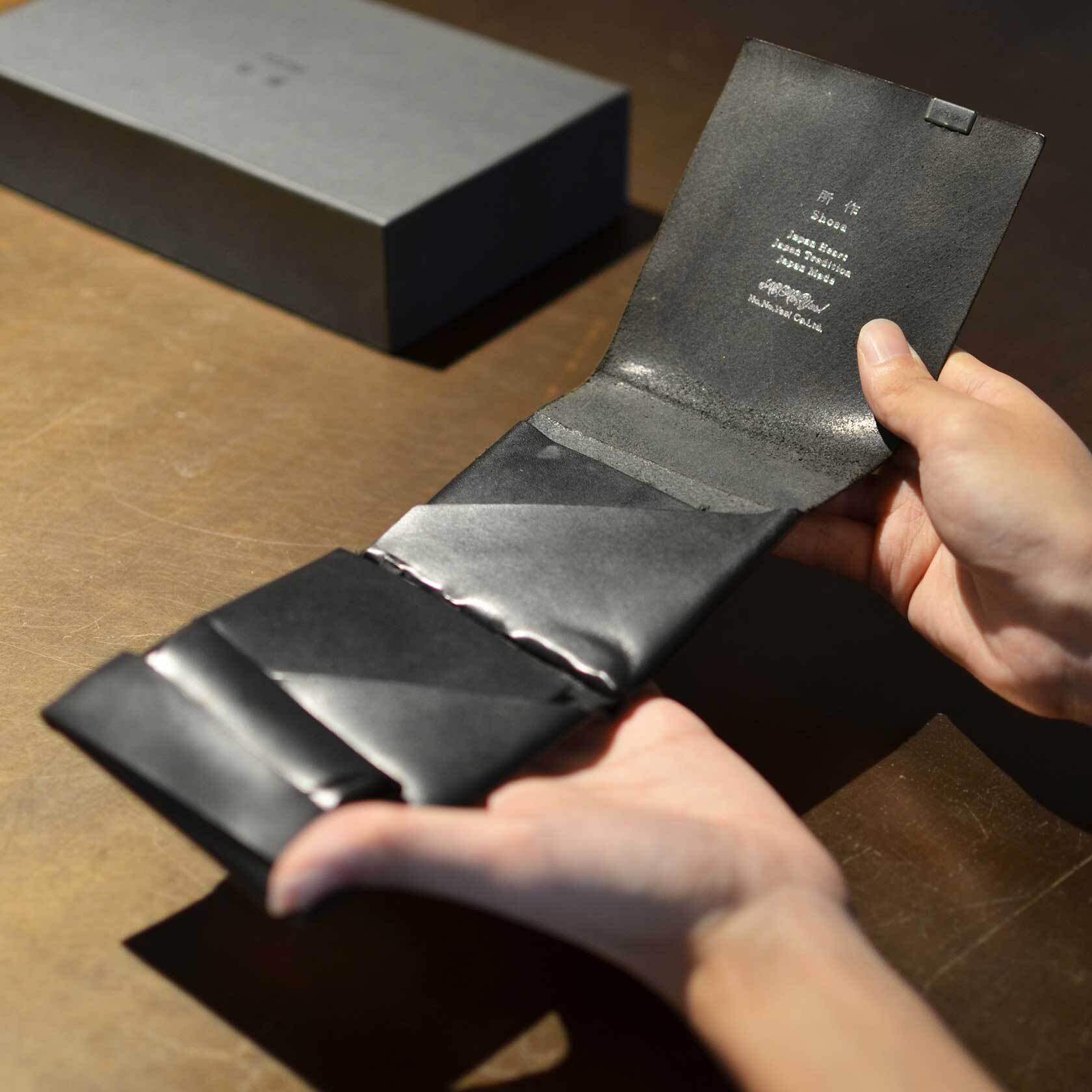 財布としての実用性はもちろん袱紗のような包みを開く優雅な動き、折形のディテールが表現できるようにと試行錯誤を重ね、完成したのが、一枚の革をを縫わずに仕立てる財布「所作」