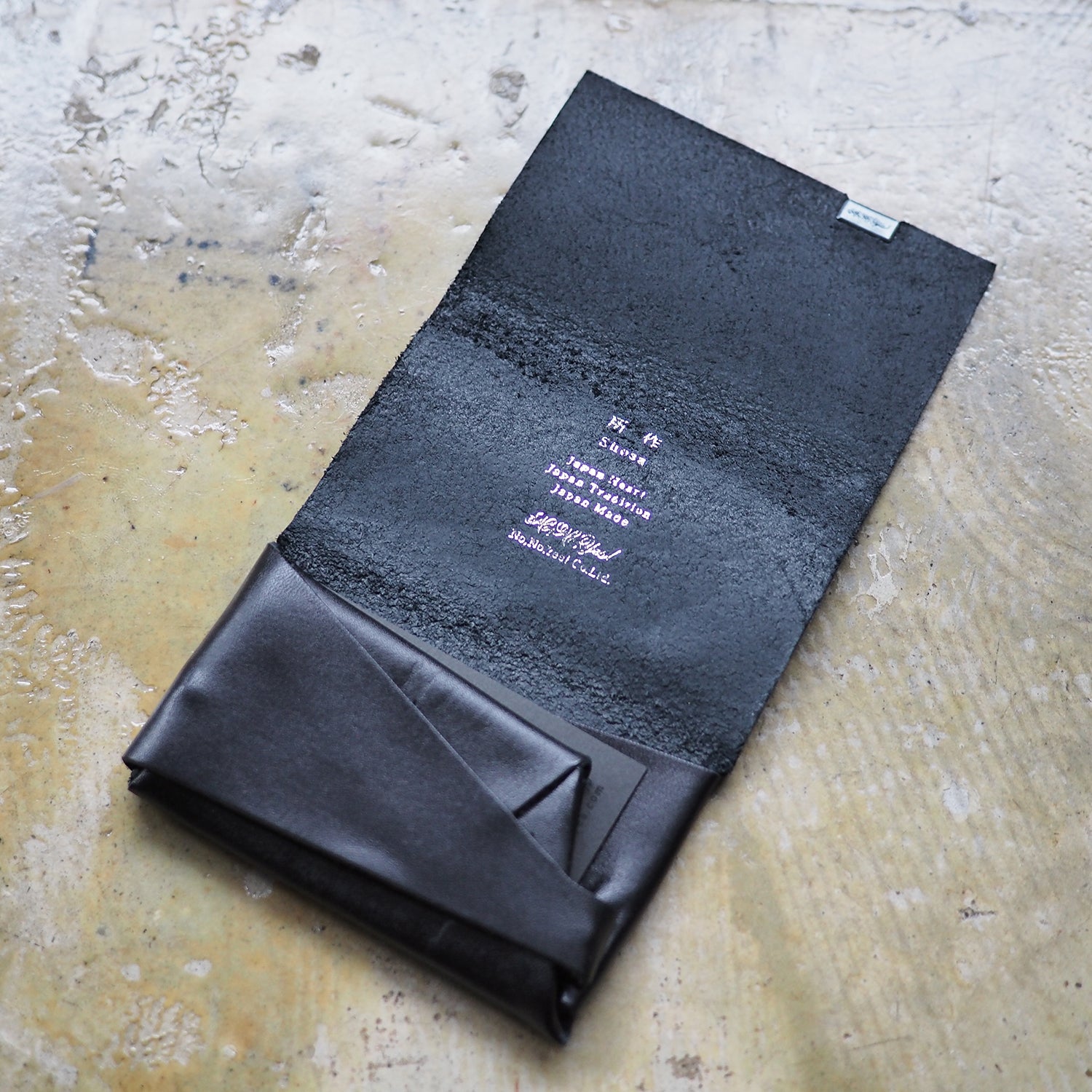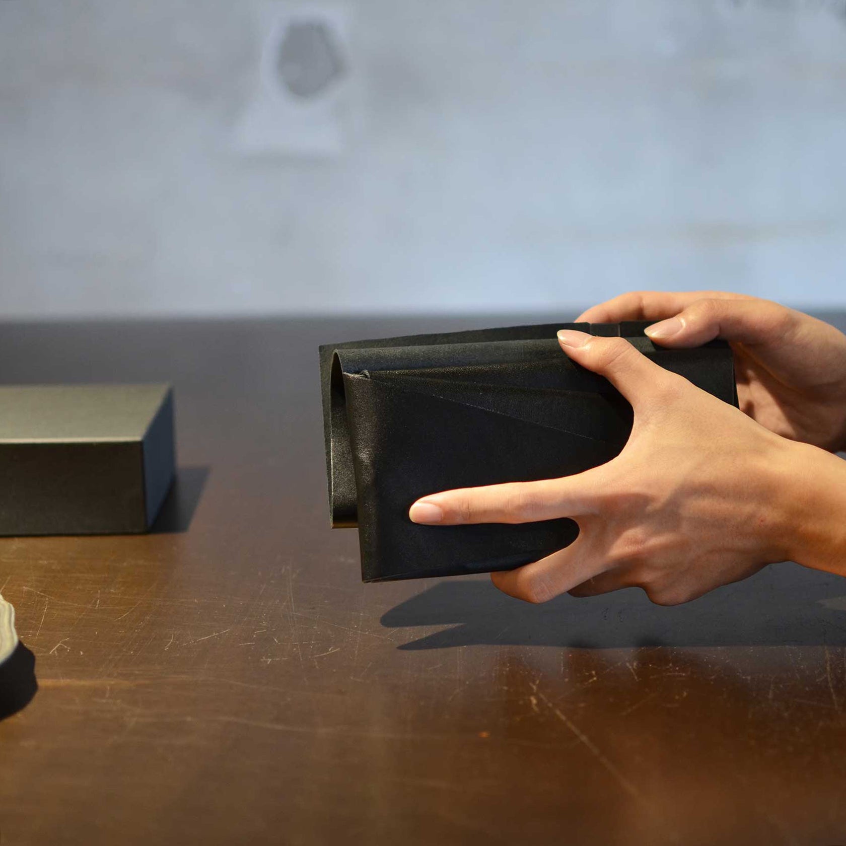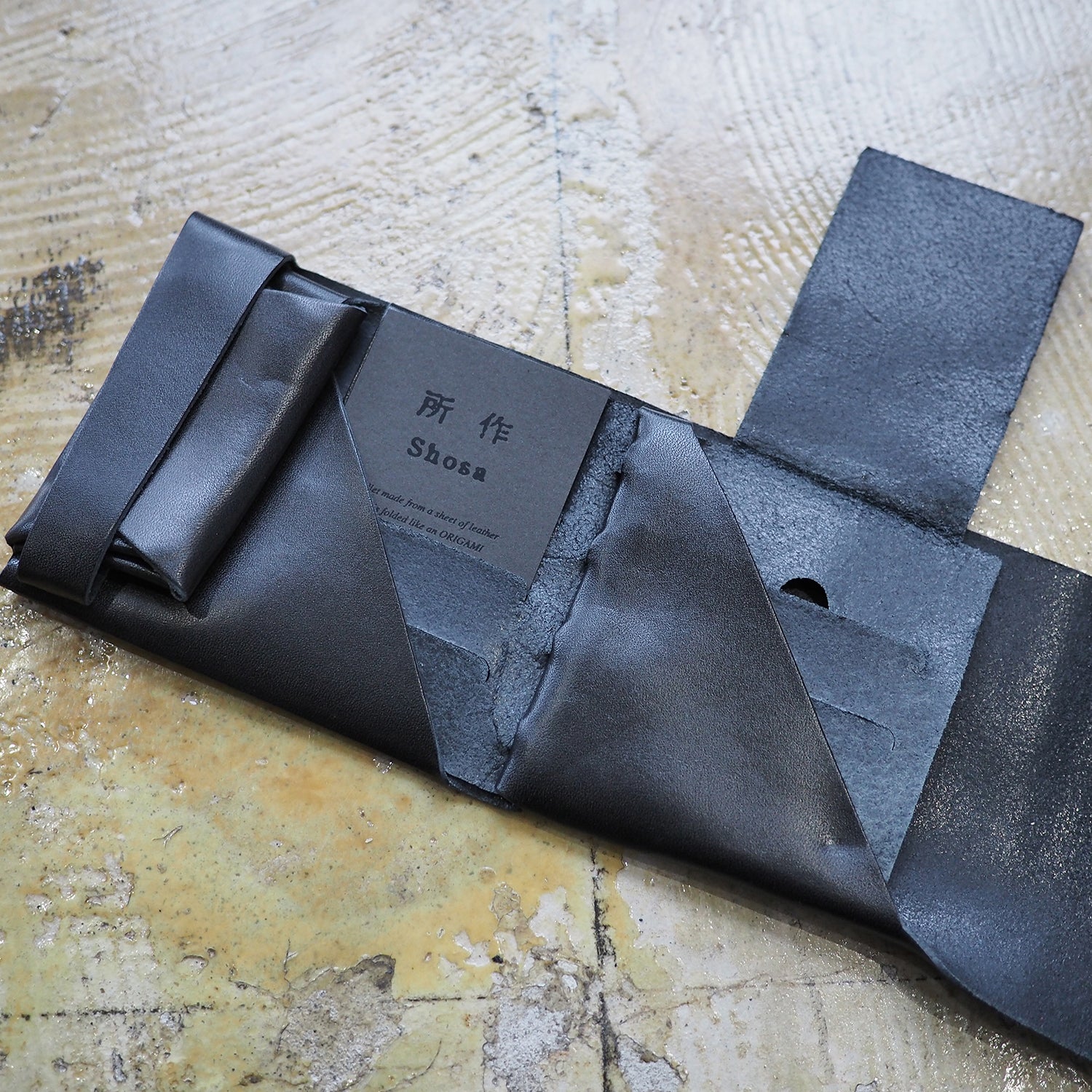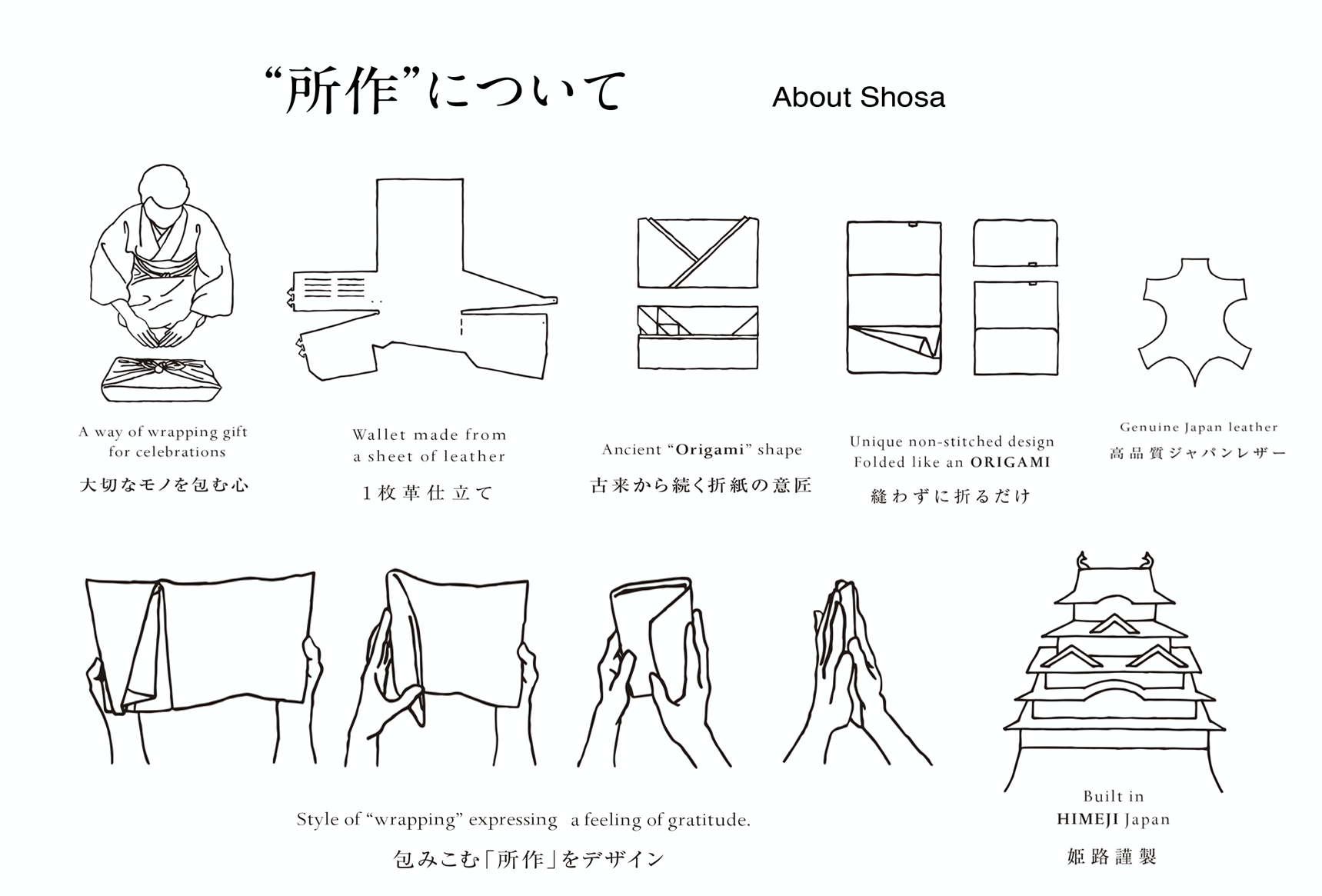 財布としての実用性はもちろん袱紗のような包みを開く優雅な動き、折形のディテールが表現できるようにと試行錯誤を重ね、完成したのが、一枚の革をを縫わずに仕立てる財布「所作」