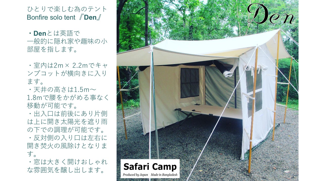 このようなキャンプ用品が合ったらいいなと思っていた20種類の中から、一番最初にお出して皆様のご意見を聞きたかったのがこの Denでございます。全く新しい形状のテントである上に近年のソロキャンプブームのニーズ合っていると思ったからです。その上、キャンプの高級志向でもあるグランピングのニーズにも対応が可能です。更に、このプロジェクトが成功すれば少なからずもバングラデシュの経済に貢献する事にもなります。是非とも皆様方のご支援にてこのプロジェクトが成功するようご協力をお願い申し上げます。