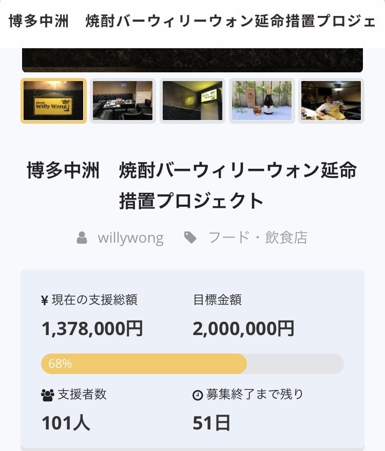 2020/08/23 13:33博多中洲焼酎バーウイリーウォン延命措置のためのクラウドファンディングにつきましてのご報告です。151名の皆様にご協力頂き、金額も200万円を越えることが出来ました!本当にありがとうございます、コロナの影響を受け、余裕などない方がほとんどだと思います。それなのにこの店のことを思ってくださり、応援してくださる皆さまに心より感謝申し上げます。中洲にあり、カラオケバーで、ライブバーでもあるウイリーウォンは、自粛の要素が全部入っており、何かといえばニュースになり、目の敵にされてるような気持ちになりへこみがちでしたが、ファンディングをはじめてこんなに沢山の方に応援していただき勇気とやる気をもらう事が出来ました!応援してくださった皆様には感謝しかありません。ファンディングはあと20日以上残っております。なんとかお店を継続していきたいので、どうか引き続きシェア、拡散をお願い申しあげます。 もっと見る