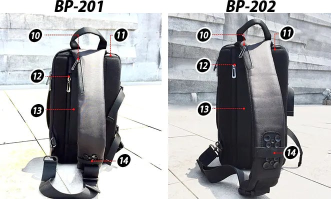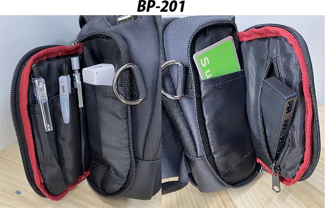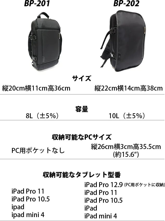 必要な機能に合わせて、2つのモデルを用意。2つのバッグは同じ機能デザインですが、BP-202には「ノートブックメザニン」があり、13~15インチのパソコンを収納できます。用途やライフスタイルに合わせてお好きなデザインをお選び下さい。