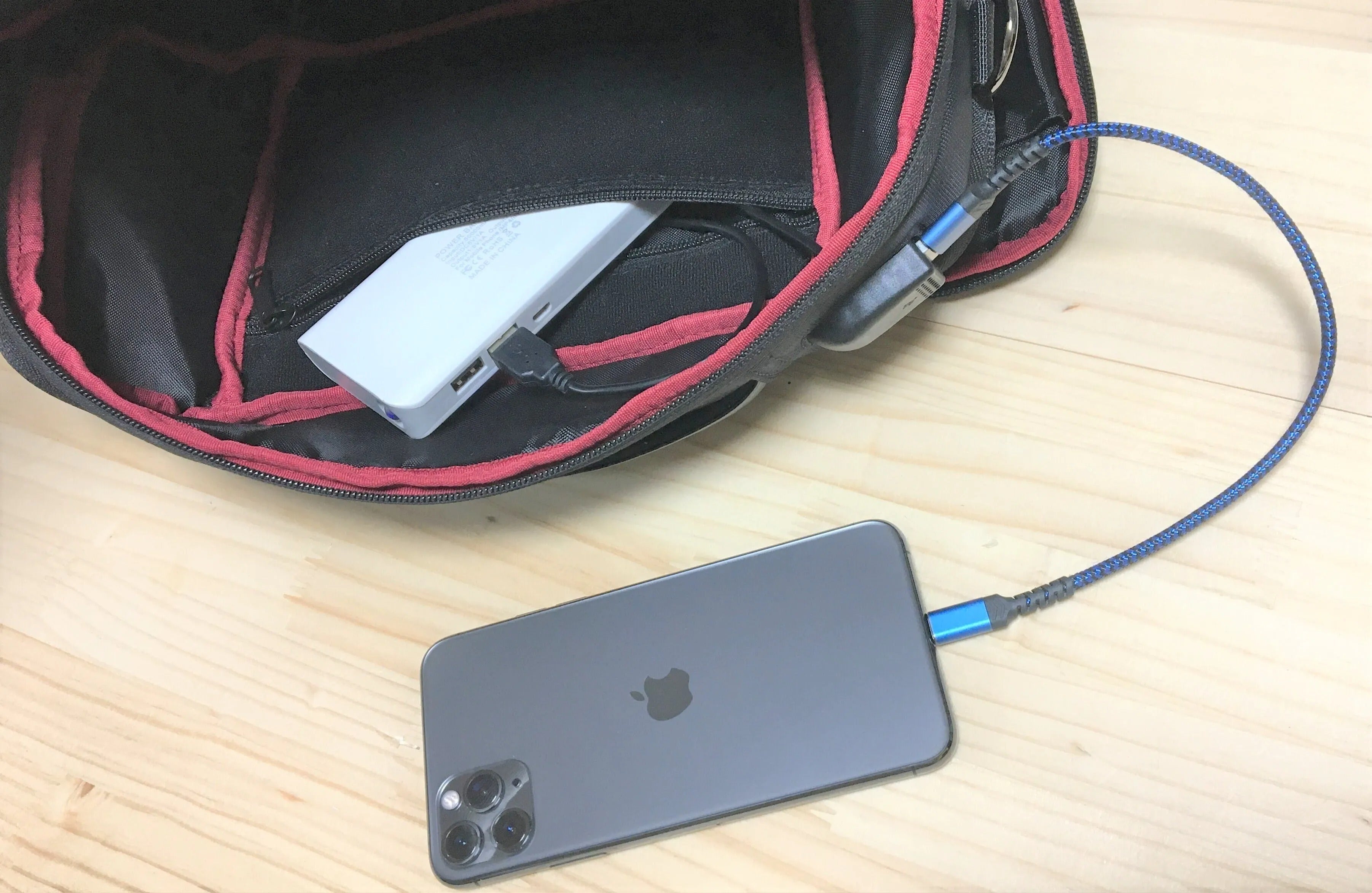 外部USB充電ポート付きで、バッグを開けなくても携帯電話を充電できます。(BP-202、BP-201共通)