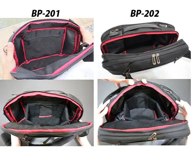 必要な機能に合わせて、2つのモデルを用意。2つのバッグは同じ機能デザインですが、BP-202には「ノートブックメザニン」があり、13~15インチのパソコンを収納できます。用途やライフスタイルに合わせてお好きなデザインをお選び下さい。
