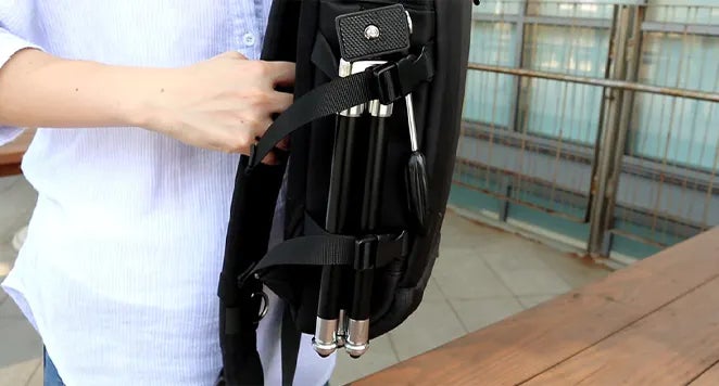 カメラの三脚や自撮り棒など棒状のアイテムを収納できます。(BP-202、BP-201共通)