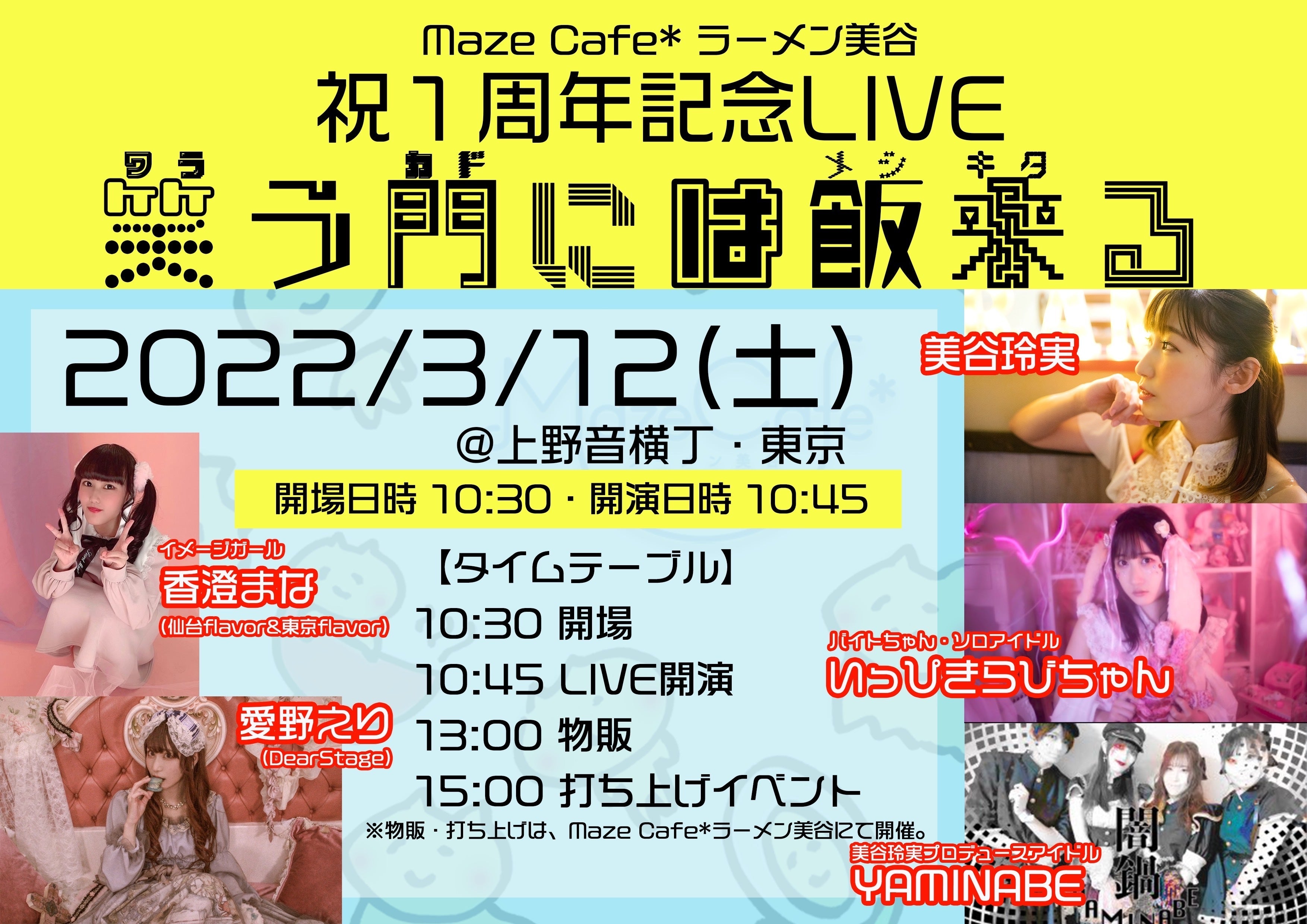 2022/03/11 16:19こんにちは!!Maze Cafe* ラーメン美谷がグランドオープンして明日でちょうど1年が経ちます!突発的なトラブルやコロナ禍の中、こうして続けられたのは皆さんのおかげです。本当にどうもありがとうございます!1周年を迎える明日【3/12(土)】ラーメン美谷から近い、上野音横丁というライブハウスにて1周年記念ライブ「笑う門には飯来る」を開催します!!!時間は10:45~12:30とチョっっっっと早い( ; ; )笑プレミアチケットは売り切れてしまってますが通常チケットはまだまだ販売中です!!チケットご購入はこちら▶︎https://t.livepocket.jp/e/ramenmitani〜出演者〜美谷玲実・愛野えり・香澄まな・いっぴきらびちゃん・YAMINABEコラボもあるかもも?残念ながら「声を出す」行為は禁止となりますが、入場者数の規制や検温など、しっかりと対策をしていただけるライブハウスです!さらに朝だしなんとなく安心…!?久しぶりの生ライブ、みんなで楽しみましょう♪今回、配信はないので来ていただけるととっても嬉しいです( ; ; )※私は明日、13:00~20:00までお店にいる予定です!食事だけとか物販だけとかもOKです!クラウドファンディングのリターンを使うだけでも大歓迎です!2ショット券・サイン券などもまだ使えるのでお早めにどうぞです!さらに〜!明日は1周年を記念して、まぜそばご注文の方は【味玉無料】トッピング!バーチャル株主会員様は、お好きな【まぜそば1杯無料】!!12:00~20:00まで営業しています!ぜひお待ちしてます♪期間限定新商品「CBDコーヒー」500円CBDにはリラックス効果があります。テイクアウトOK!ちょっと一息のお供にどうぞ♡エクストラミルク+50円 お好みでお砂糖をどうぞ♡ もっと見る