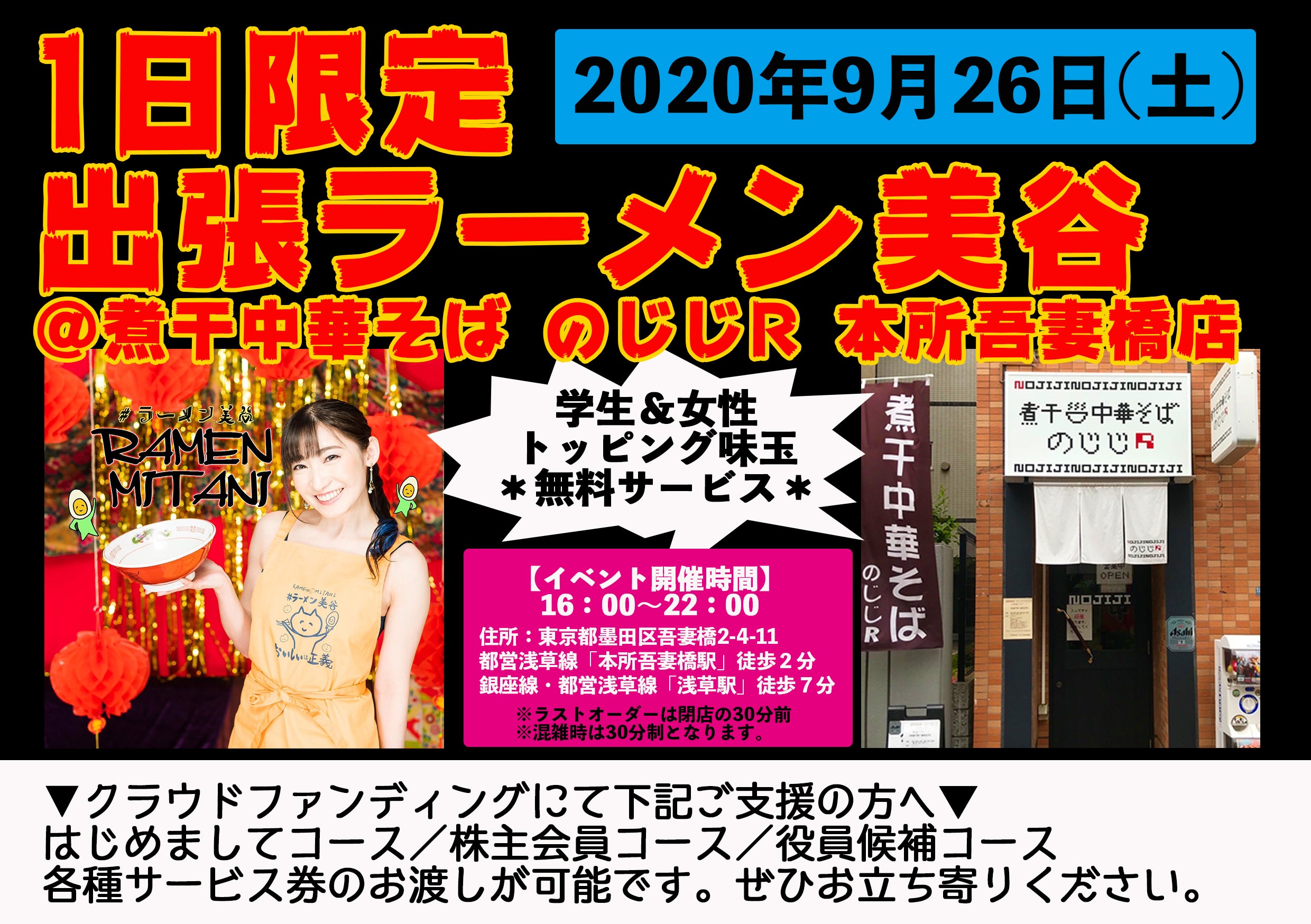 2020年9月26日(土)16:00〜22:00《煮干中華そば のじじR》様にて1日限定!サービス券のお渡し会を兼ねて「出張ラーメン美谷」の開催が決定しました!!!この日限定の\オリジナルまぜそば/をご提供いたします。店長のご好意でなななんと!【学生&女性】は味玉トッピングを無料サービス!!(数量限定)どなたでも是非お気軽にお立ち寄りください♪※ラストオーダーは21:30。混雑時は30分制となります。※クラウドファンディングで・はじめましてコース・株主会員&役員コースご支援の皆様へ各種サービス券のお渡しもいたします。お渡しのみでも可能ですので、ぜひお立ち寄りください♪【予定メニュー】・クリームチーズまぜそば・サッポロビール/レモンサワー/ハイボール・はちみつレモネード/他ソフトドリンク・ピンショットチェキ ほか美谷玲実も閉店時間までお待ちしております(^○^)ーーーーーーーーーーーーーーー煮干中華そば のじじR 本所吾妻橋店https://tabelog.com/tokyo/A1312/A131203/13211489/都営浅草線「本所吾妻橋駅」より徒歩2分都営浅草線・銀座線「浅草駅」より徒歩7分ハートの煮干バターが可愛い♡ーーーーーーーーーーーーーーー