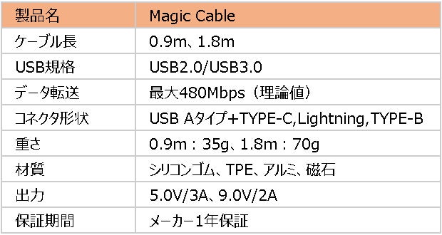 端子の接続部分だけでない利便性を追求。 ケーブル本体にも特許所有の「MagicCable機構」を採用することで 今回の商品が誕生いたしました。