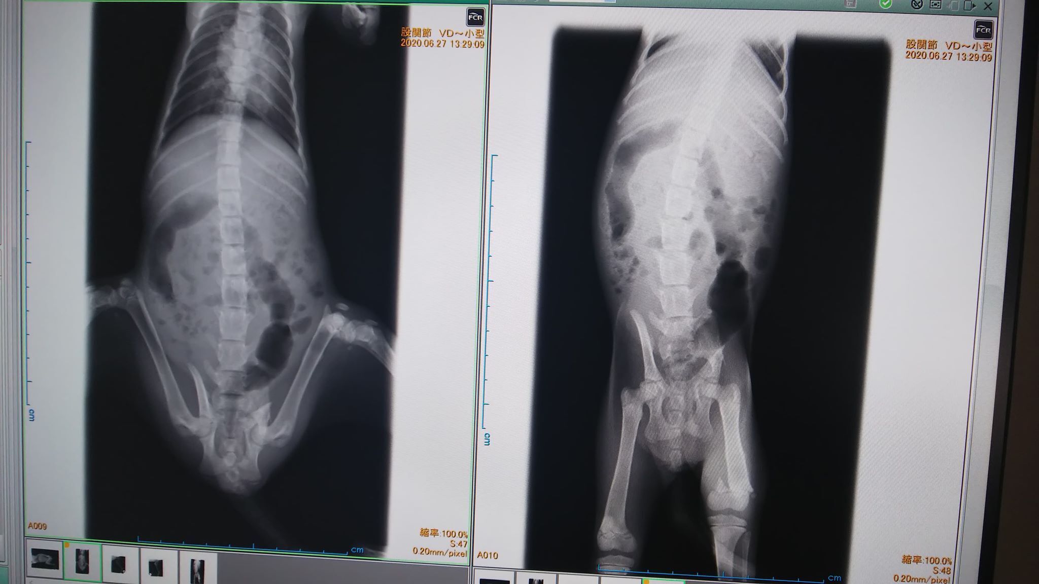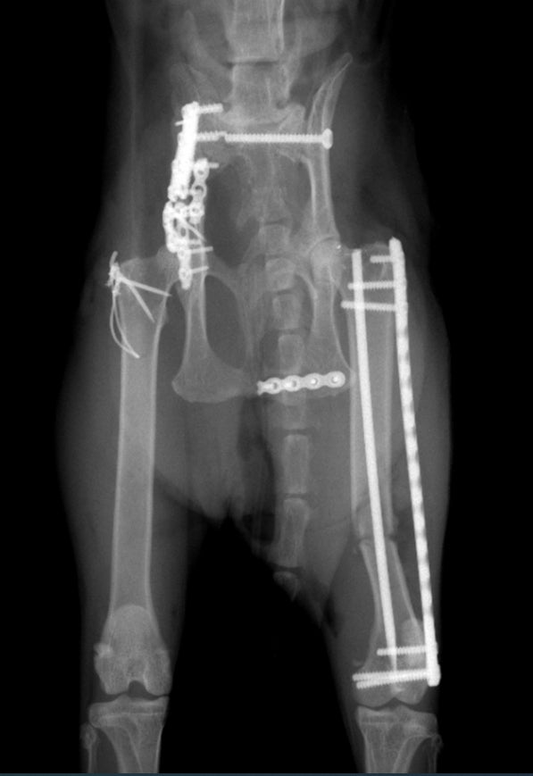 骨盤脱臼、左右腸骨、尾てい骨、大腿骨関節付近、尾の7箇所骨折と内出血。