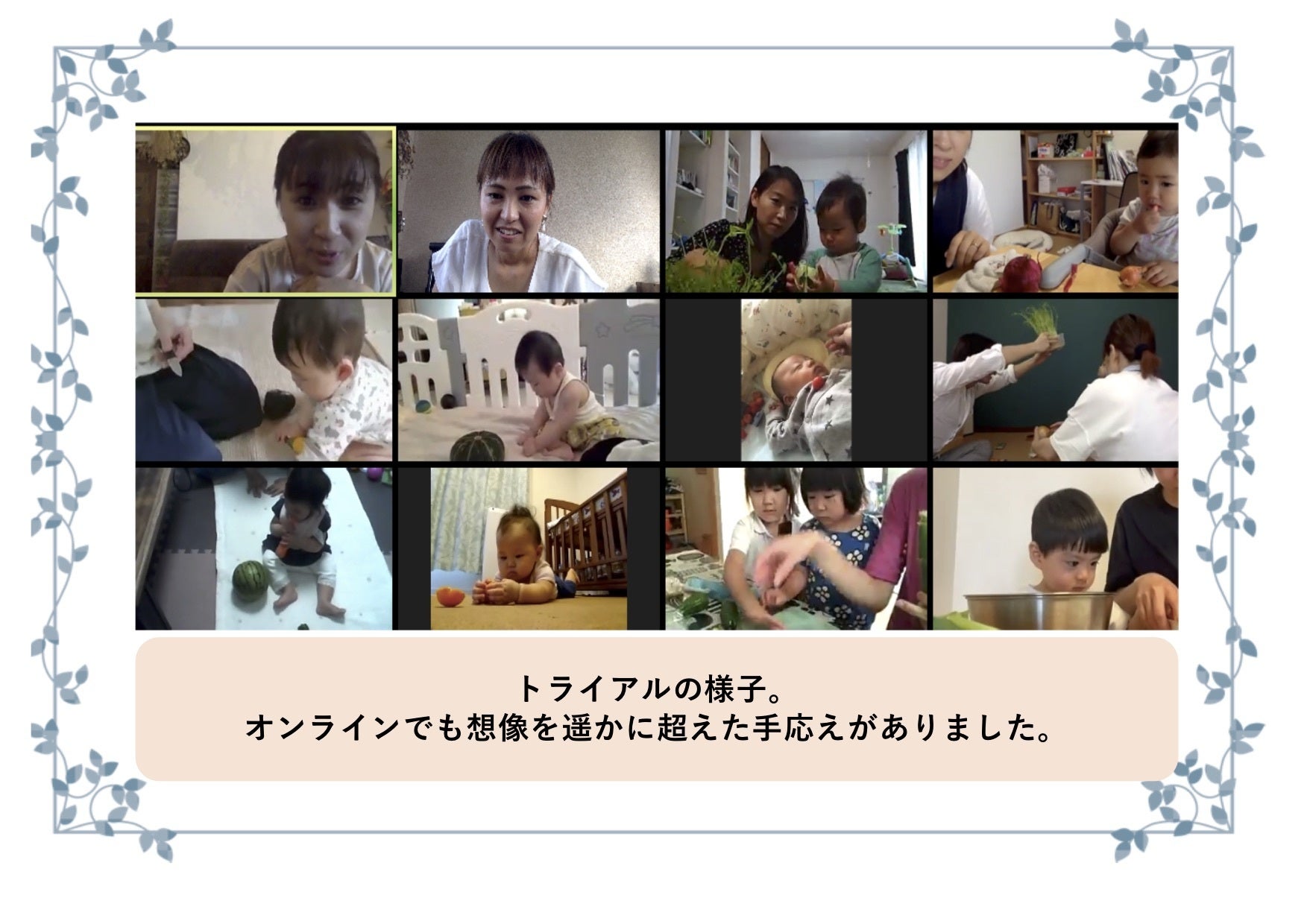 *他のオンライン保育園は、こどもに対するプログラムを一方的に与えられるだけで得られるものが少なかった。このおやこ保育園は本物! 先生からも仲間からも沢山の気づきをもらえて、リアルに繋がれているような絆ができた。(0才児ママ)