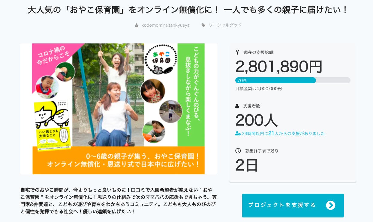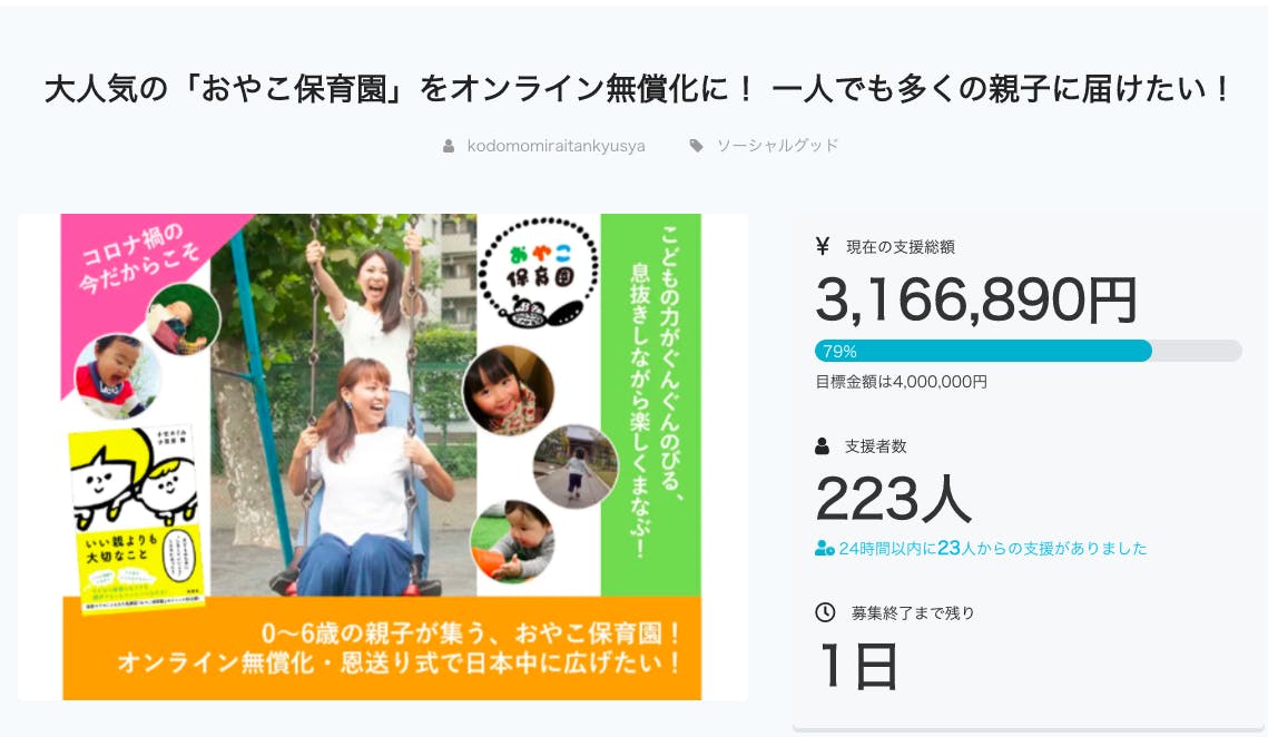 2020/10/13 22:37いよいよあと1日。なんと1日で50万円ほどのご支援をいただくことができ、79%まできました。ご支援のメールが来るたびに、たくさんの人たちのやさしさのバトンを受け取ることができて、心から感動しています。どうぞ最後まで応援のほど、よろしくお願いいたします!=========================残り 1日!現在 3,166,890円 79%達成!ご支援いただいた方:223人大人気の「おやこ保育園」をオンライン無償化に! 一人でも多くの親子に届けたい!https://camp-fire.jp/projects/302656/========================= もっと見る