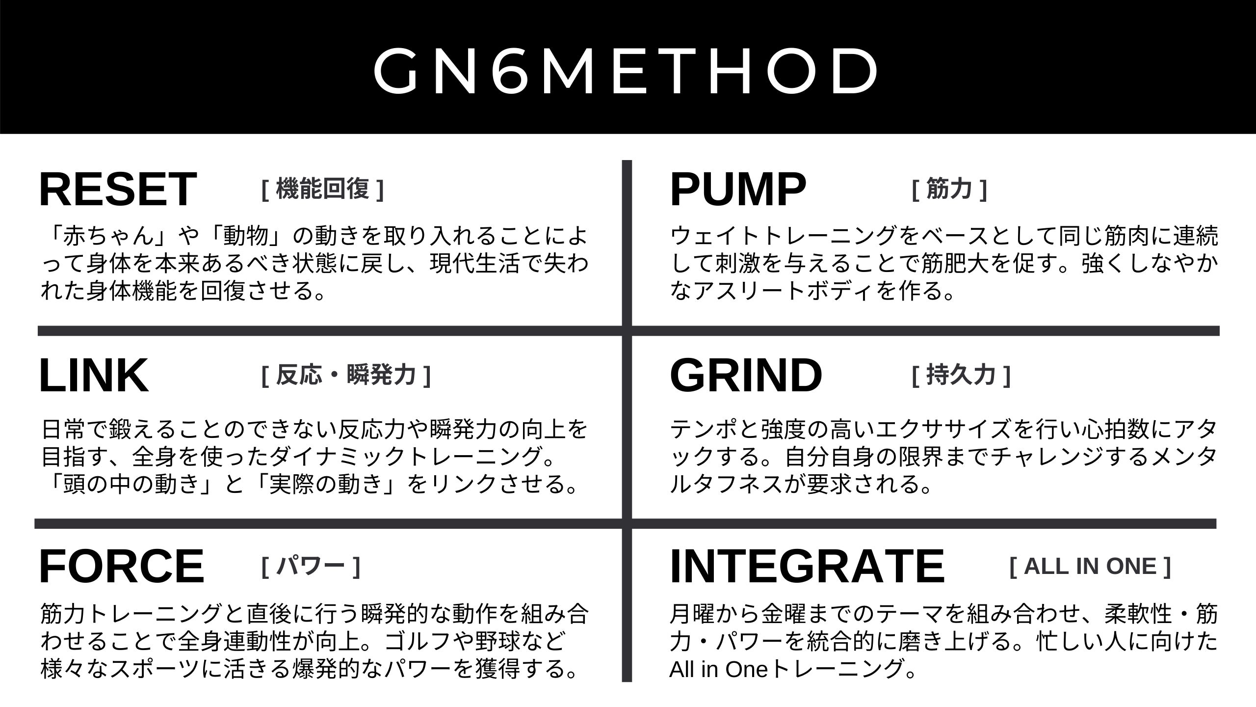 「動作を鍛える」というコンセプトで6つのトレーニングメソッドを開発しました。