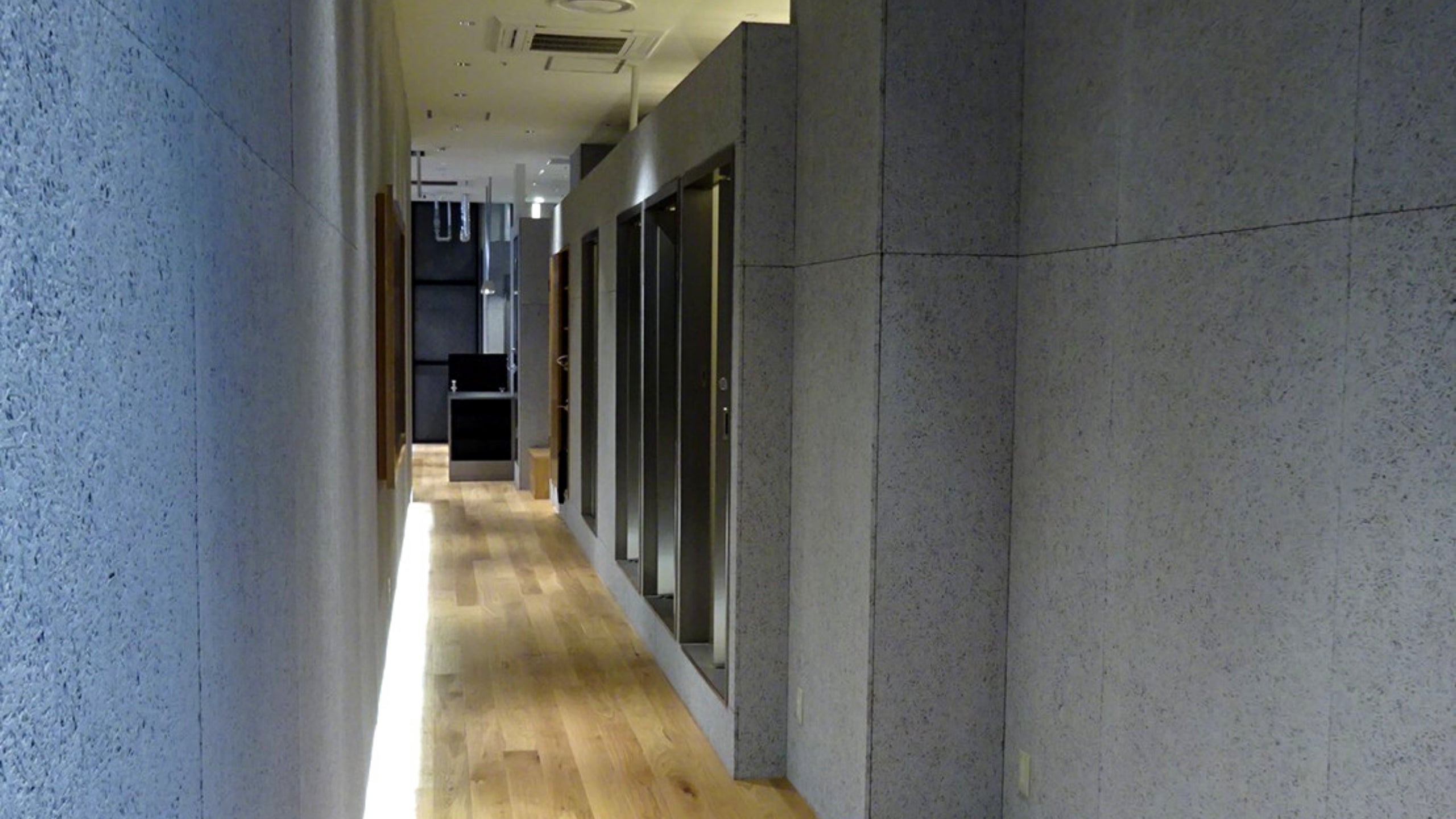 更衣ブースが並ぶ廊下は、日常から離れて自分に向き合う準備の時間。性別が曖昧なこの時代に男女別の更衣室はそぐわないと判断し、4つの個室(うち2つはシャワー付き)としました。コロナ禍においては、更衣室内での密集を避けられるという思わぬ利点となりました。