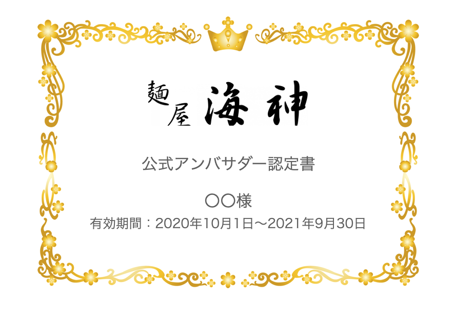 twitterやinstagramなどで掲載できる、麺屋海神の公式アンバサダーとして任命致します。