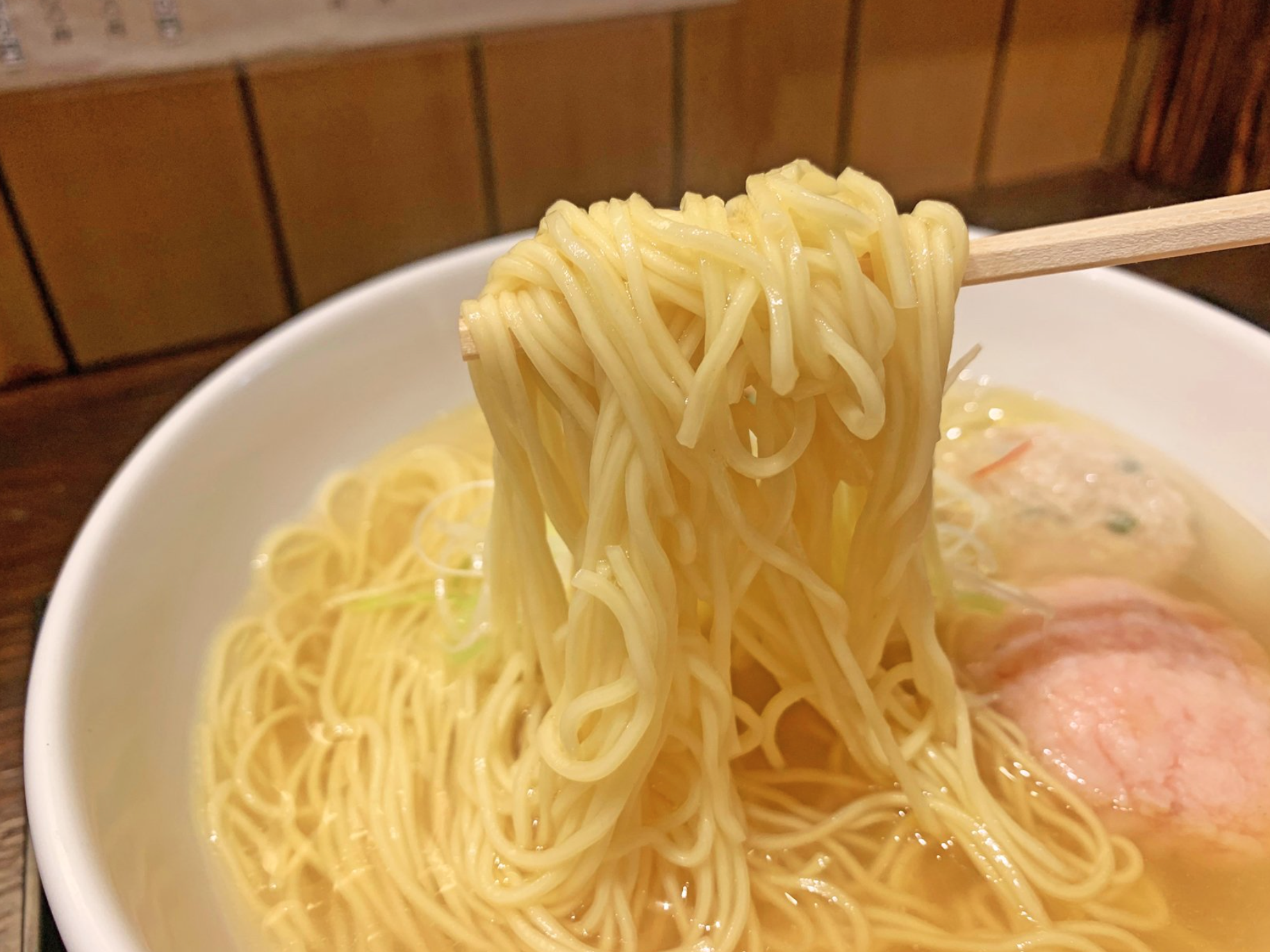 2種類の小麦粉をブレンドして、炭で浄化した水で練った特注麺です。小麦粉のグルテンを結束させてコシを生むために、低温で熟成させてから使用するので、細麺ですがしっかりした歯ごたえがあります。