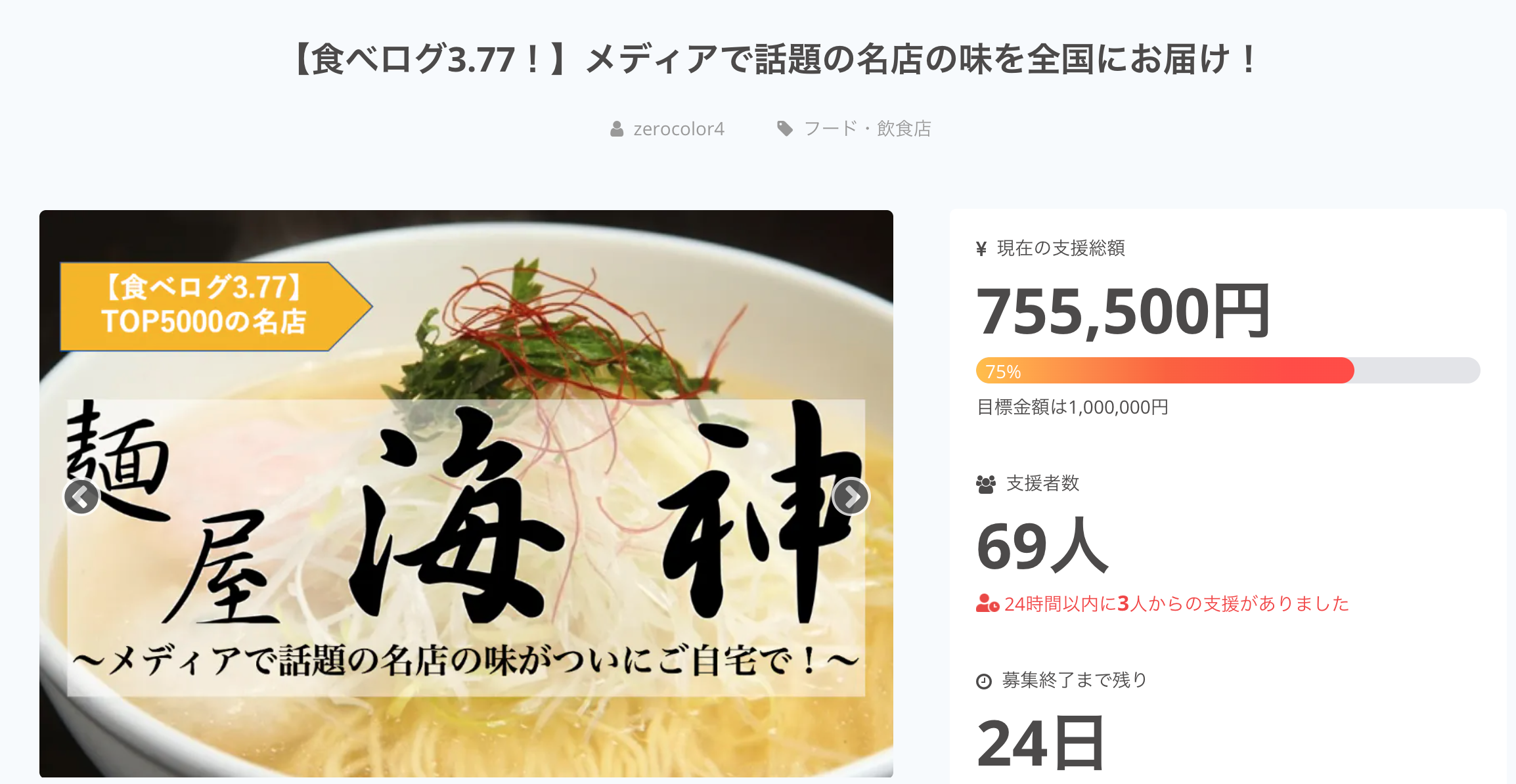 開始16日で75%達成!全国の人たちにもっとラーメンの味を届けたい!