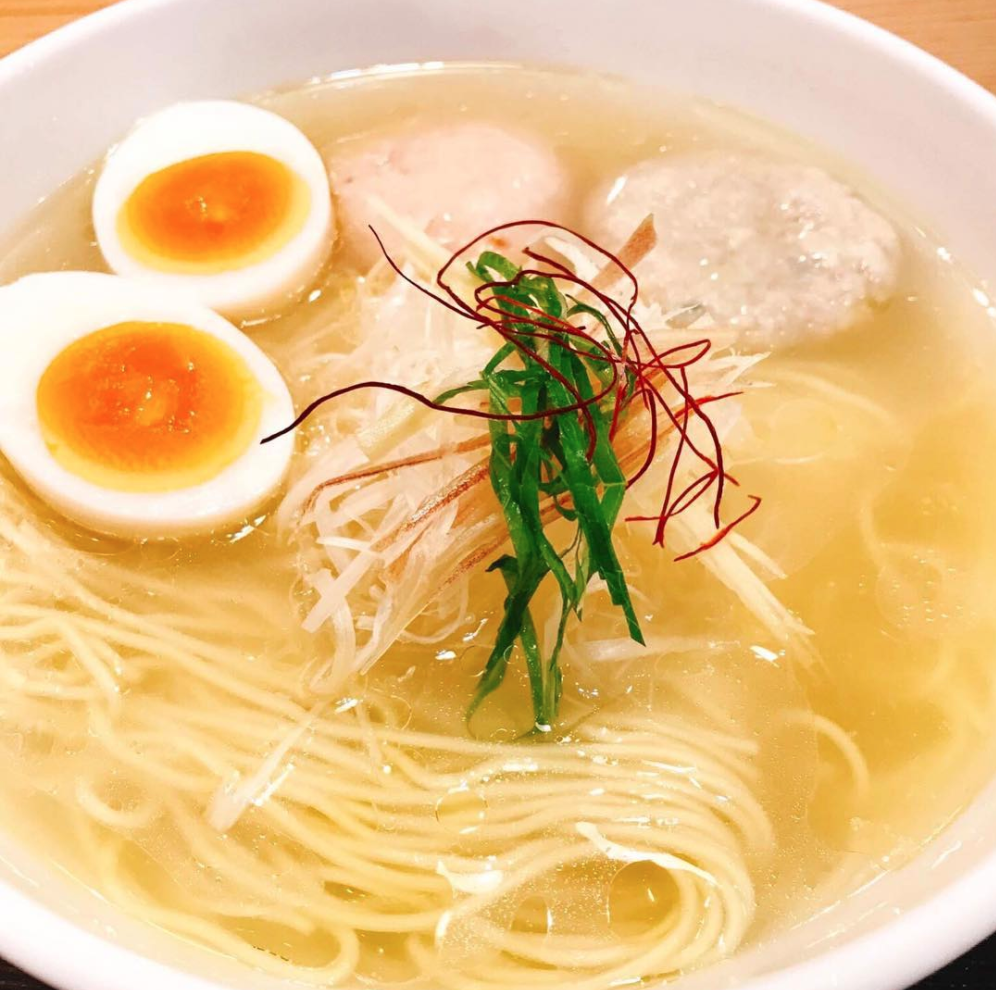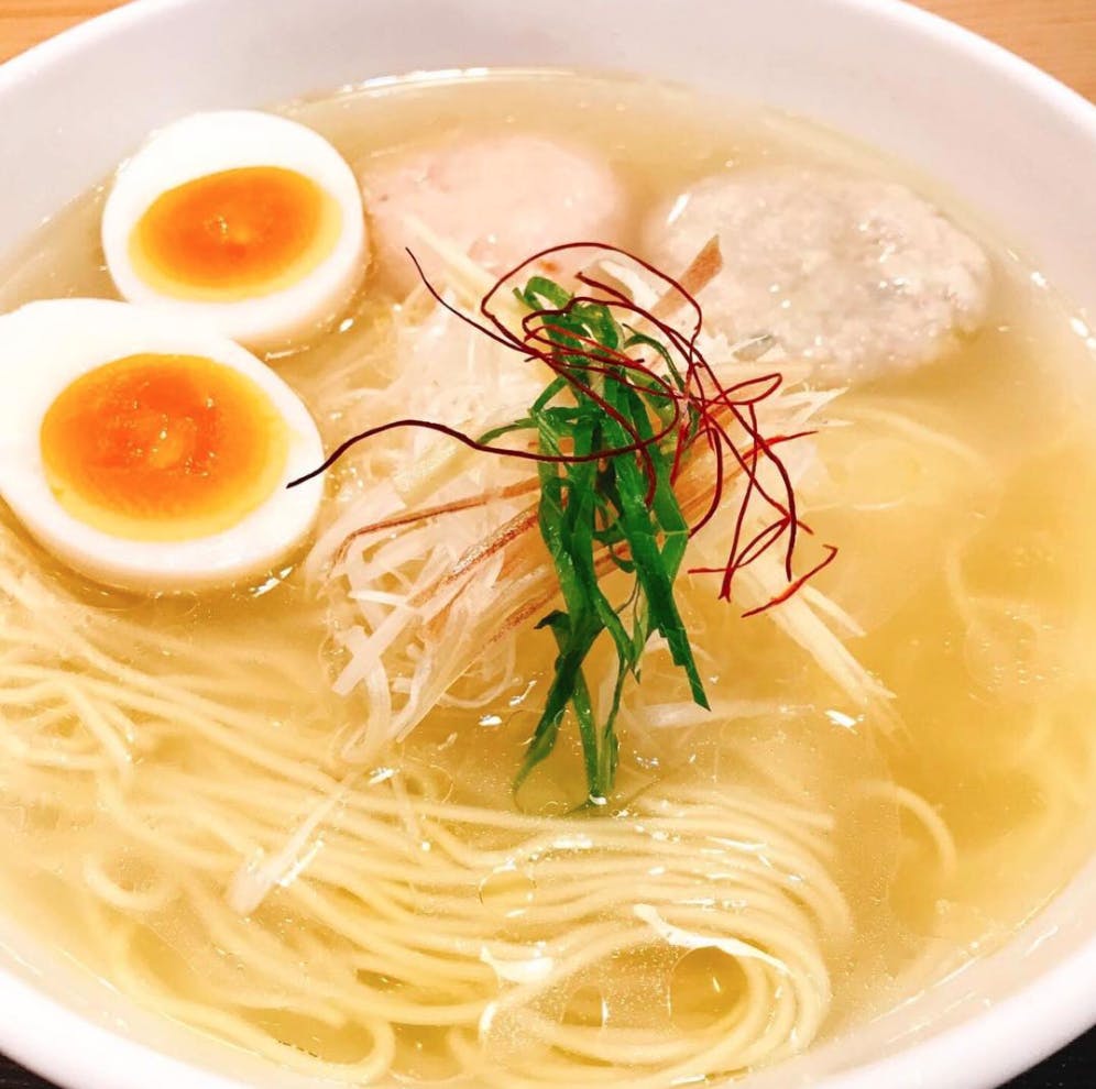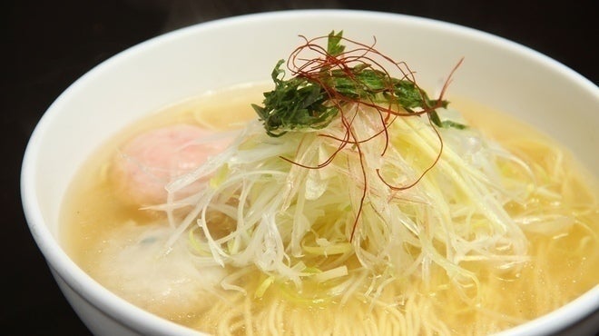 鱈のすり身に海老を練り込んだつみれと、細かく叩いた軟骨を散りばめた鶏つくねを乗せました。スープの味に変化を出すために薬味は白髪ねぎ、みょうが、針しょうが、大葉、糸唐辛子の五種類を乗せています。