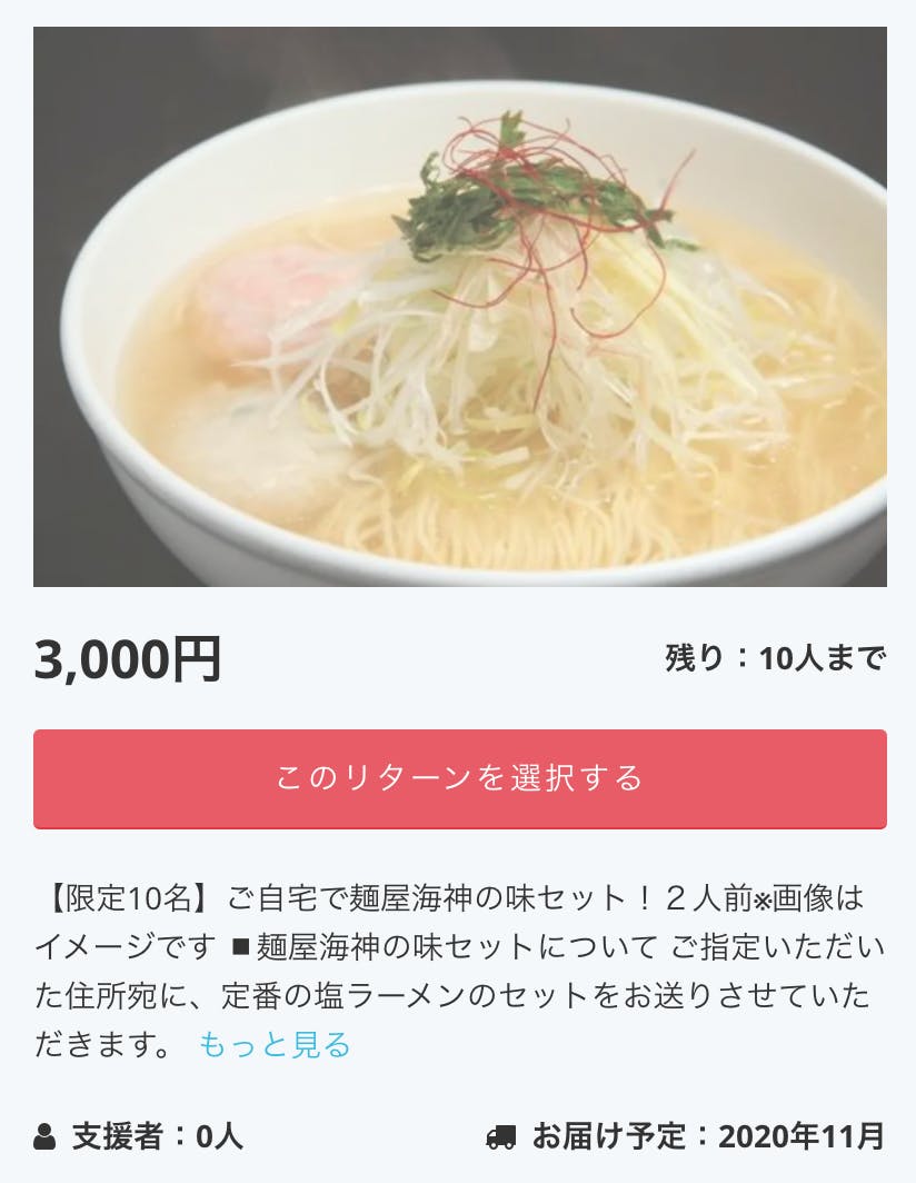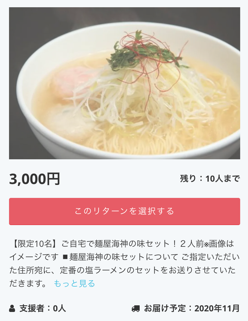 2020/09/14 21:45いつもご支援ありがとうございます。麺屋海神です。皆様のご支援のお陰で、目標金額まで残り16万円となりました^_^支援者数も続々増え、全国のたくさんの方々に、麺屋海神のラーメンを届けていく準備が整ってきております。__________さて、クラファン開始から半分の日数が過ぎ、早割で売り切れの商品も出て参りました。そこで、新しく3つのリターンを追加させていただきましたので、ご確認ください!__________◼︎麺屋海神の味セット4人前+公式アンバサダー◼︎定期便3人前×3ヶ月__________ご支援いただいた方は、是非ご友人の方にもお声がけいただけますと幸いです。まだご支援いただいていいない方は、是非ご興味のある商品がございましたら、チェックしてみてください。宜しくお願い致します! もっと見る