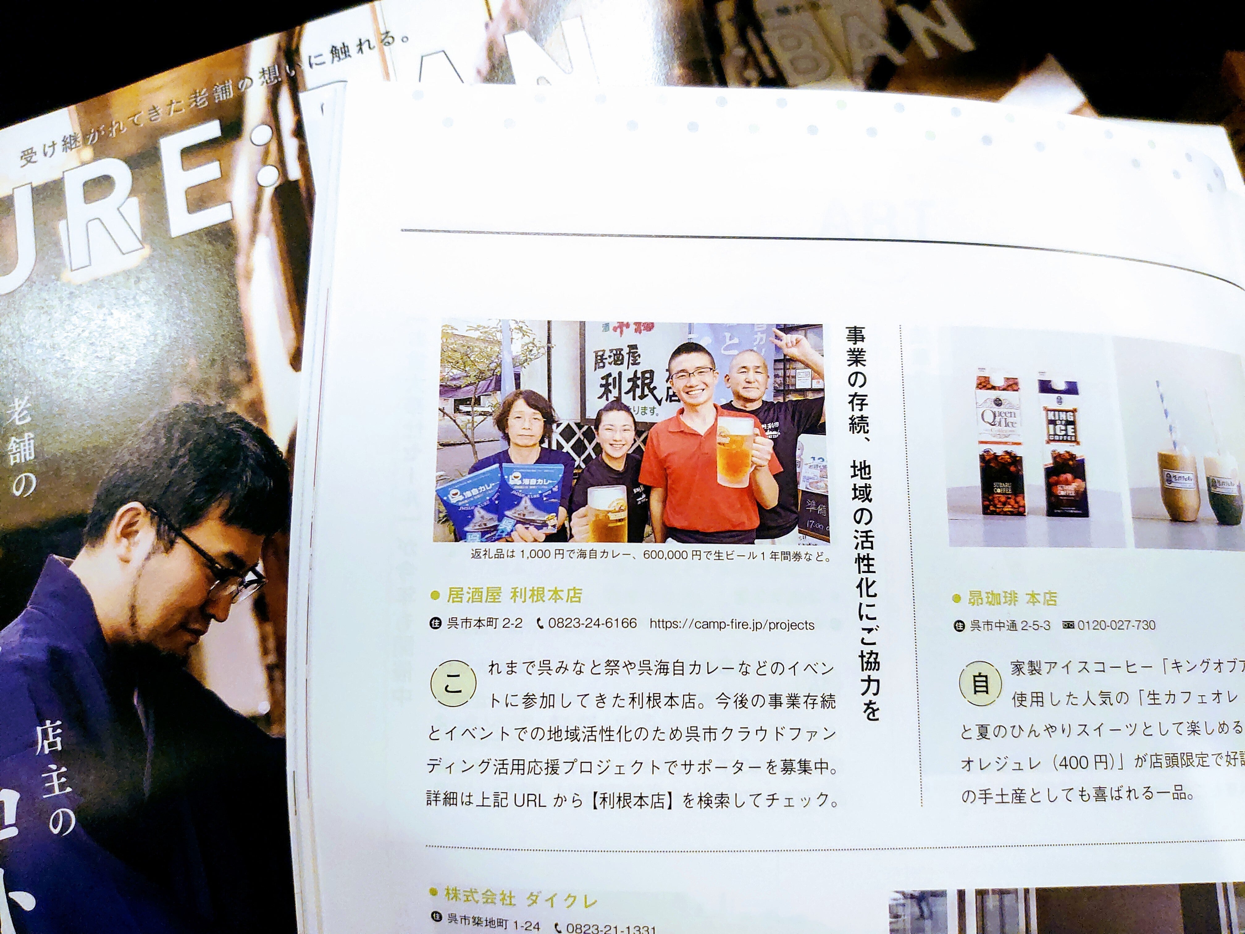 呉の地域誌「くれえばん」さん8月号にも居酒屋利根本店のクラウドファンディングを取り上げていただけました♪(73ページ)