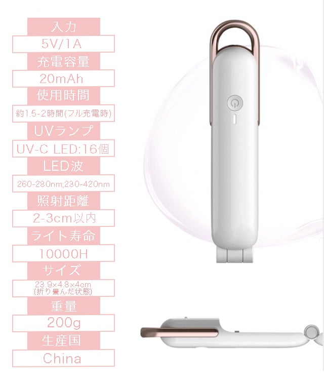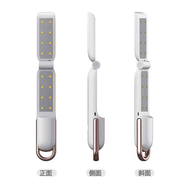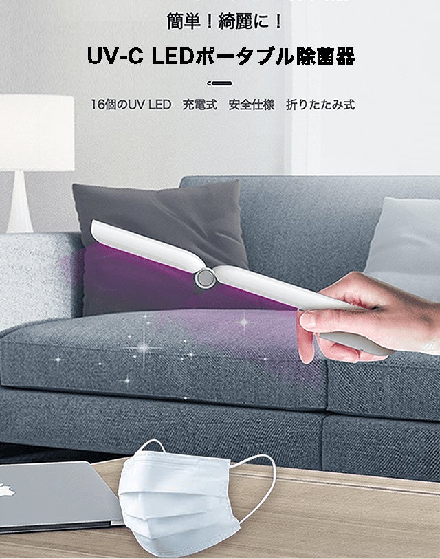 このポータブル除菌器は、折畳のコンパクト設計で手軽に携帯・持ち運びができ、いつでもどこでもなんにでも除菌をすることができます。
