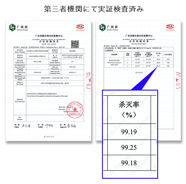 第三者機関の公的機関による検査においても、99%除菌の結果がでています。