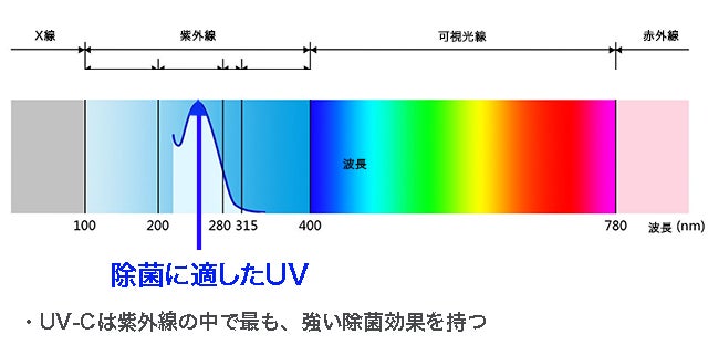 紫外線(UV)にはA波・B波・C波がありますが、このポータブル除菌器は、紫外線の中で除菌に適して効果のある、紫外線C波(UV-C)を使用しています。