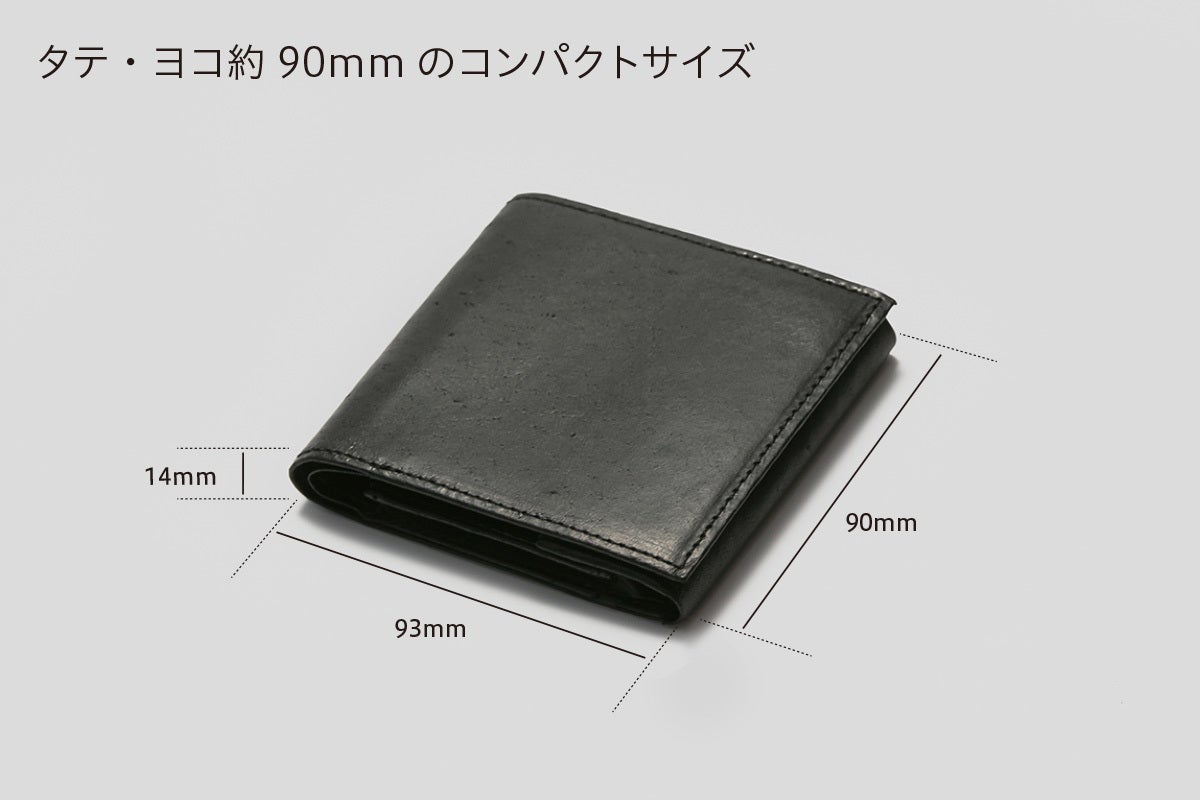 パンツの前ポケットにもすっきり収まる約9cm角のサイズ。コシの強い芯材入りの構造なので、小銭が増えても膨らみにくく、薄さをキープします。