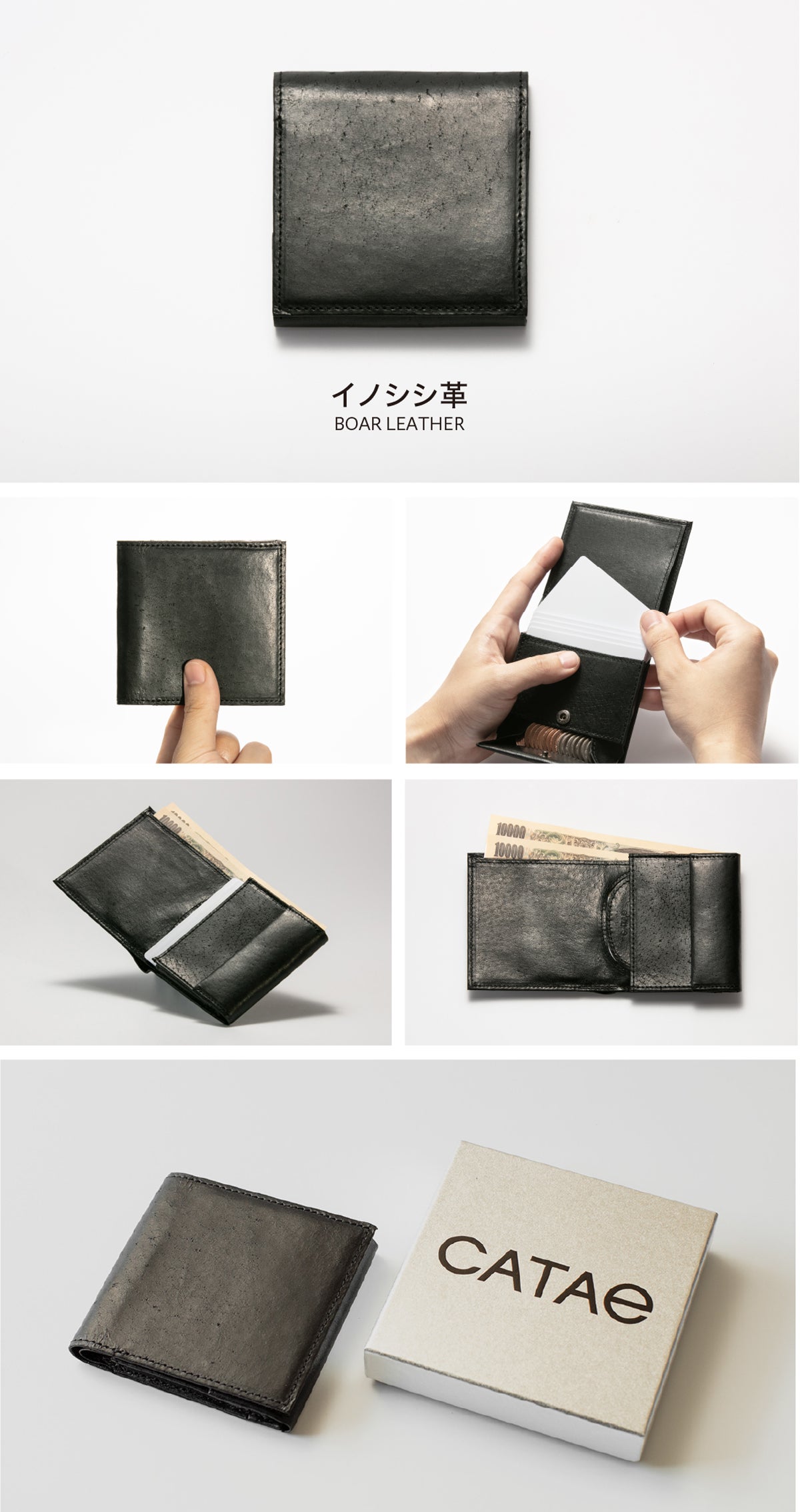 リターンとして、CATAe(カタエ)本体を化粧箱に入れてお送りします。 野生のイノシシ革を使った製品と、牛革(オイルダコタ)の製品をお選びいただけるようにしました。