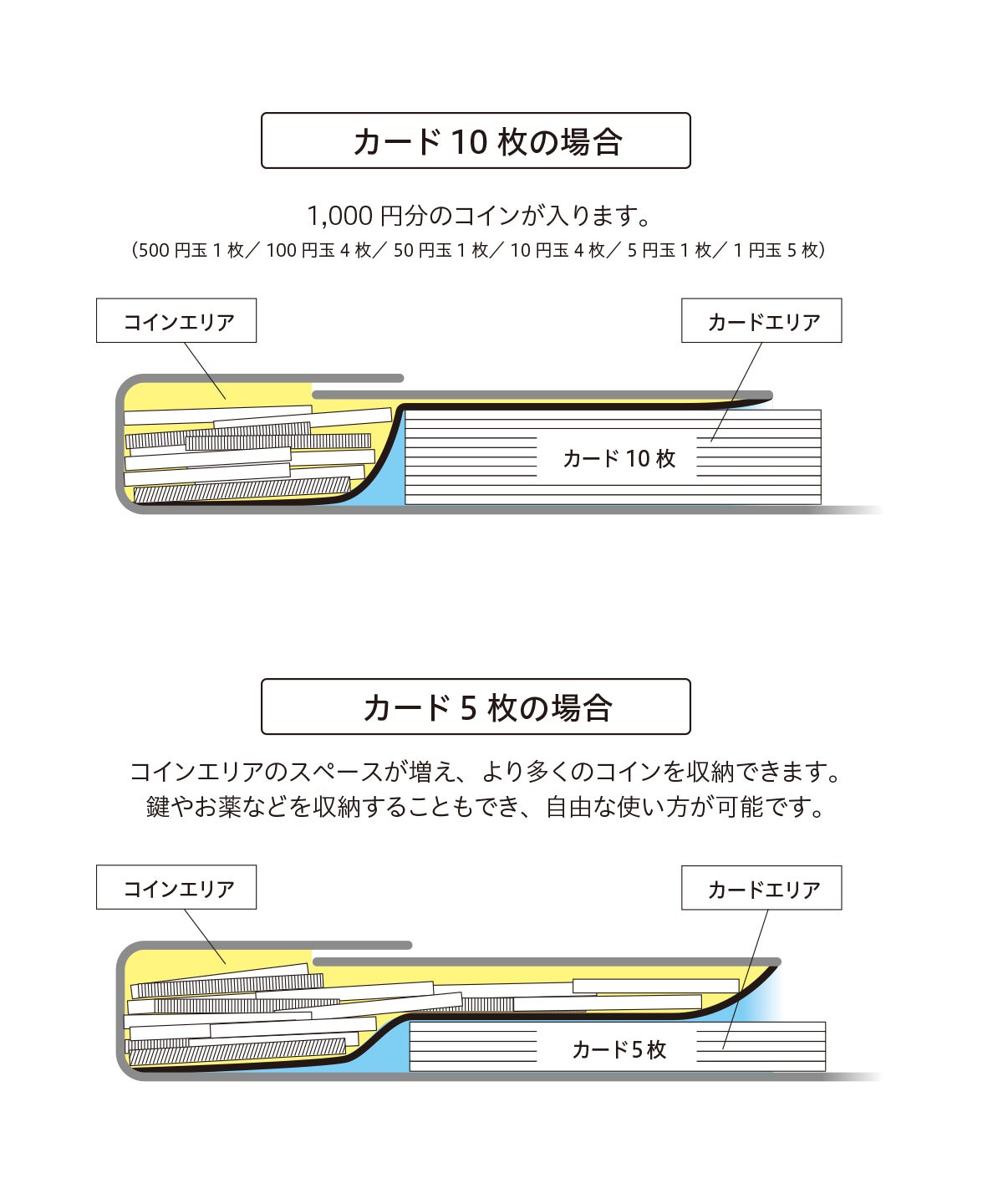 コインエリアには、カード10枚が入った状態で、充分な枚数のコイン(1000円分)を収納。カードを減らせば、空いたスペースにさらに多くのコインを収納できます。