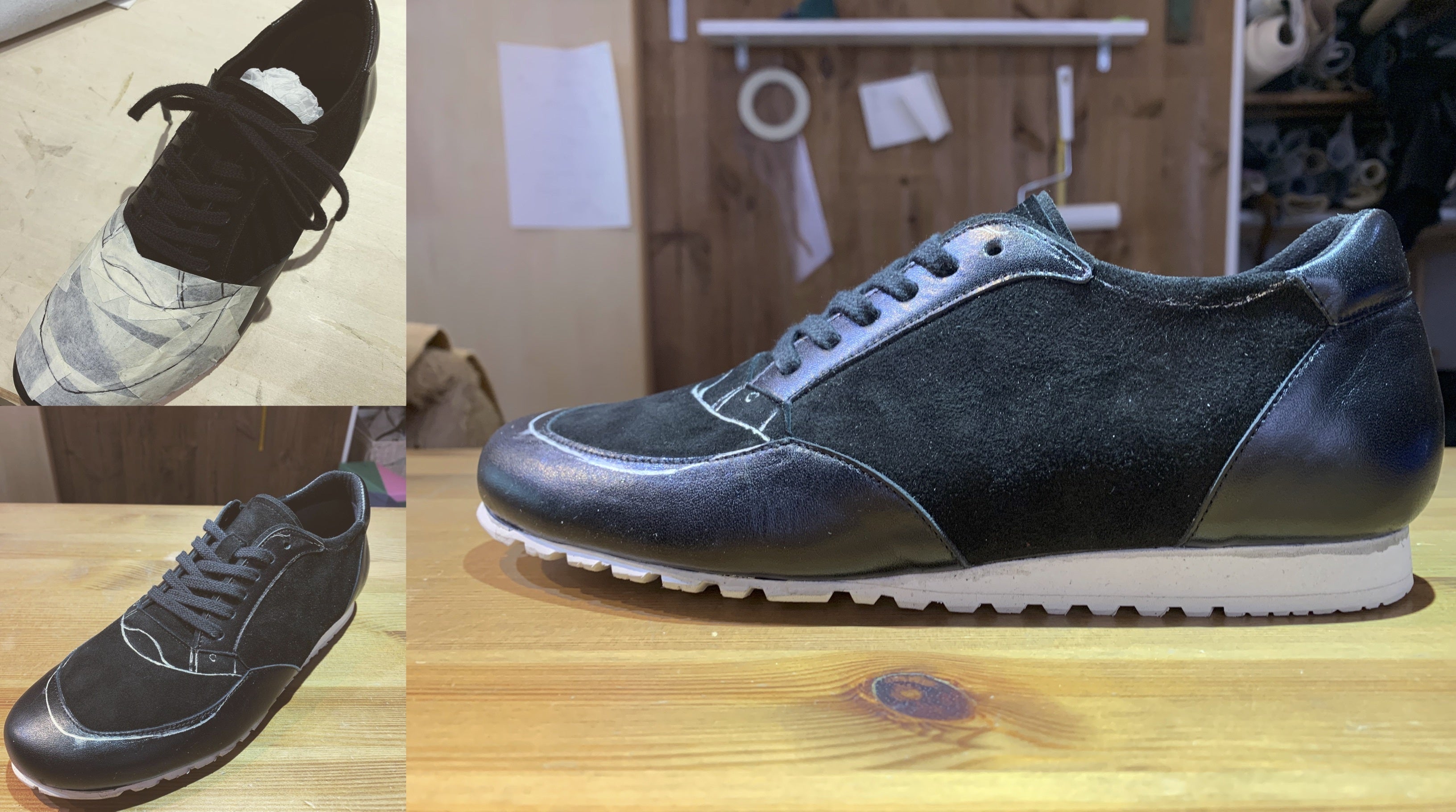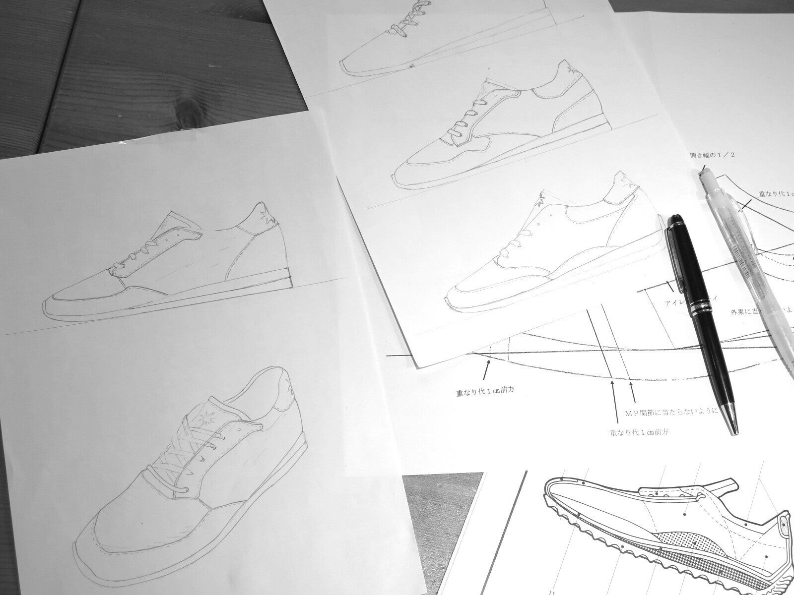 たくさんのデザイン画から靴になり、履き心地までをこの段階でイメージしていきます。今回はレトロ感と現代デザインの融合を意識しました。