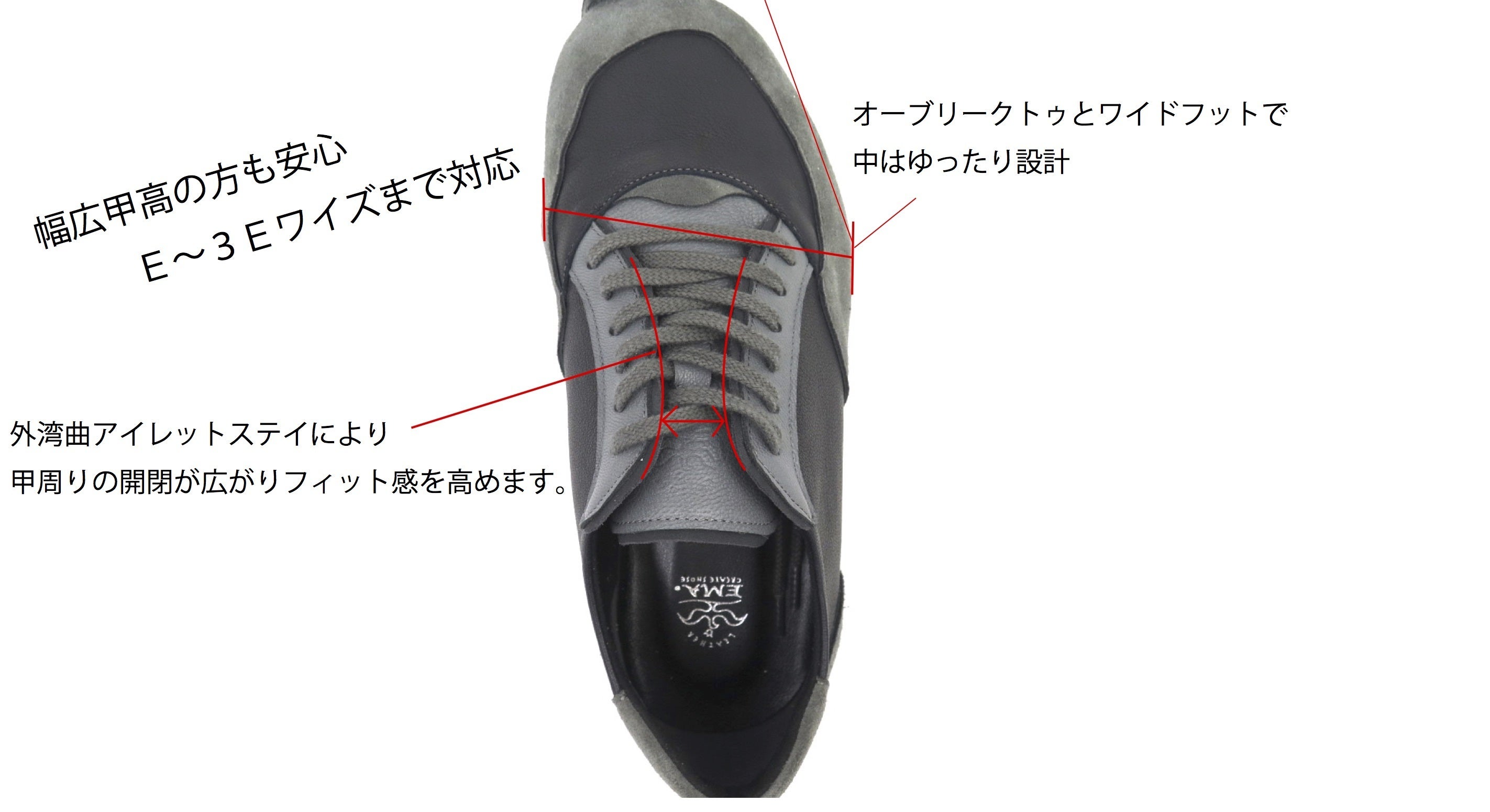 E〜3Eまでの横幅に対応。外湾曲アイレットステイによるシューレース部の開閉域が広がり多様な足型設計。