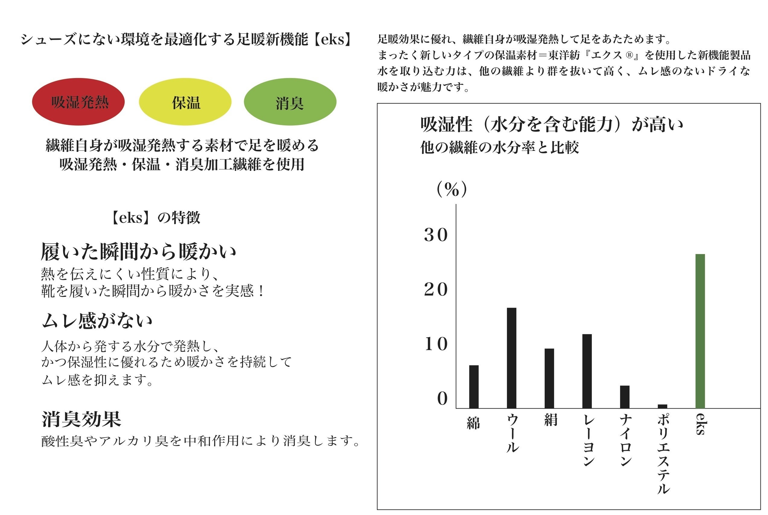 この繊維は繊維自身が吸湿発熱する素材で足を温める全く新しいタイプの新機能製品です。熱を伝えにくい性質で速暖効果に優れその上酸性臭やアルカリ臭を中和性により消臭します。