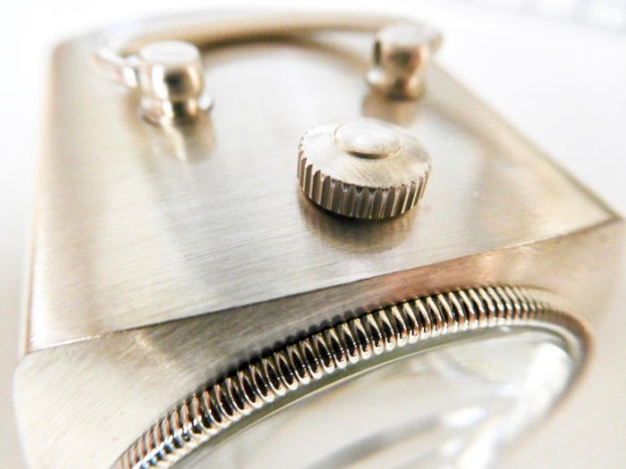 ベゼル部分の彫りは、ダイヤモンドカッターで200線の切り込みを入れています。リュウズ部分もコインの様な切り込みとアールを上部に加え、凹凸を施しました。