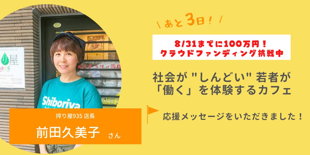 クラウドファンディング【社会が "しんどい" 若者が「働く」を体験するカフェを開きたい!】も、8月31日(月)23:59の終了まで、あと3日。