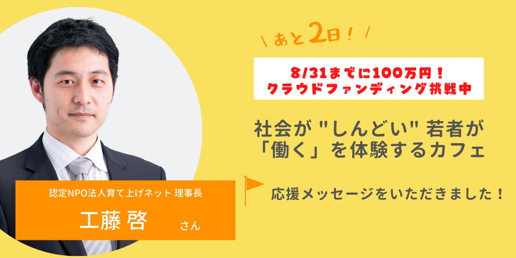応援コメント第10弾をお届けします!本日は、すべての若者の「働く」と「働き続ける」を実現できる社会を目指し、若年無業やひきこもり状態などの、働きたいけれど働けずにいる若者の自立を目指し、就労訓練の運営や、家族を孤立させない活動に取り組んでいる、認定NPO法人育て上げネットの理事長、工藤啓さんからいただいた応援のメッセージをご紹介します。*****認定NPO法人育て上げネット 理事長 工藤啓さん約2000名の若者に、就労支援を受ける目的を聞きました。そして、「働く自信をつけたい」と回答された若者が非常に多くいました。個別相談や履歴書添削、面接練習なども重要ですが、彼ら・彼女らが望んでいるものは、実体験であり、うまくいった経験です。そして失敗しても笑ってくれるひとたちがそこにいる環境です。このような取り組みに強く共感するとともに、これからの若者の「働く」支援は多様性と寛容性に満ち溢れた空間と関係性をより重視したものになると考えます。若者に「社会がしんどい」と思わせない社会や地域、そしてカフェをみんなで作っていく、私もその一員としてサンカクさせていただきました。小さな応援をみんなで!*****応援のメッセージありがとうございます!サンカクシャは、それまでの経験から自分のことを無力に感じていたり、自分の中に「したい」「できる」という気持ちを持てたりせずにいる若者をサポートしています。誰しも、大人になるまでに、小さな経験を重ねながら、成長していくと思います。誰かに出会って、何かと出合って、やってみたいことがうまれたり。小さな失敗を少しずつ消化して、できることを広げていったり、自信をつけていったり。今回のカフェは、まず一歩「ここだったら挑戦できるかもしれない」「やっぱり失敗することもあるけどもう一回頑張ってみよう」と、若者が経験を積める場にしていきたいと思っています。若者が自分の将来に向き合い、前に一歩一歩進んでいく、その背中を私たちサンカクシャと一緒に見守っていただける方が、ひとりでも増えればこんなに心強いことはありません。【社会が "しんどい" 若者が「働く」を体験するカフェ】を、ここで働く若者たちを、応援よろしくお願いいたします!クラウドファンディングはついに、残り2日となりました…!現在110名を超える皆さまに応援いただいております。カフェでご利用いただけるコーヒーチケットやフードチケット付きリターンもご用意しております。ご友人へのSNSなどでの「シェア」や「寄付」で、最後まで、応援よろしくお願いいたします!!*****緊急開催!サンカクシャの活動説明会を、明日30日(日)13:00より開催することが決定しました。若者の居場所の運営や、企業と連携した社会サンカクの機会づくり、最近は住居のサポートなども始めたサンカクシャの活動がまるっとわかるこの機会。・支援の網の目からこぼれ落ちやすい若者への、いまある支援の特徴・支援が若者に届かない課題を乗り越えるために、大切にしていること・若者を支えるためにサンカクシャがおこなっている活動の全貌などを、代表荒井からお話しします。ぜひご覧ください。イベント詳細はこちらから↓https://www.facebook.com/events/3347342118687291