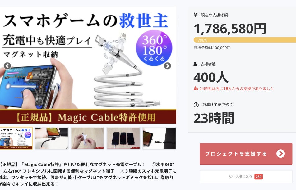 お世話になっております。本日は『Magic Cable540°』の「商品展示」についてご案内させていただきます。アメリカで話題の「b8ta(ベータ)」という「体験型の小売店」が今年8月、日本初上陸を果たしました。『「体験型ストア」b8ta(ベータ)新ラインナップが一挙登場!11・12月の新商品43種類以上を新たに発表』https://prtimes.jp/main/html/rd/p/000000010.000053185.html※急きょ決まりましたため、リストには出ておりません。”世界中のイノベーティブな製品を発見、体験、購入できる場を提供”というコンセプトスペースとなっております。現在ではb8ta Tokyo – Yurakucho(有楽町電気ビル1階)b8ta Tokyo – Shinjuku Marui(新宿マルイ 本館1階 )の2店舗展開されております。https://b8ta.jp/pages/shoplistこの両店舗様にて、昨夜より1月末まで『Magic Cable540°』が展示されております。コロナ感染症で大変な時期ではございますが、店舗様ではしっかり対策をとられております。また、お近くの方にしかなかなか伺えない機会ではありますが、よろしければお立ち寄りいただき、商品を手にとってご覧いただけますと大変ありがたいです。「Magic Cable540°」の公開は残り4日間となってまいりました。https://camp-fire.jp/projects/view/328266最後までどうぞよろしくお願いいたします。『Magic Cableプロジェクト スタッフ一同』